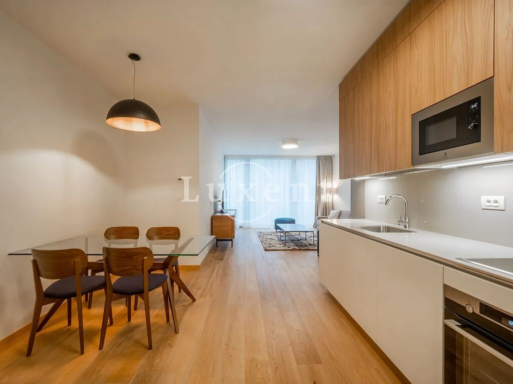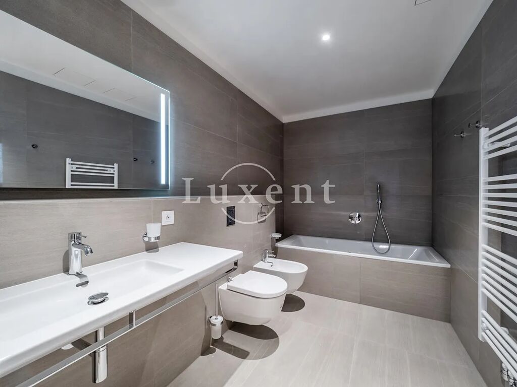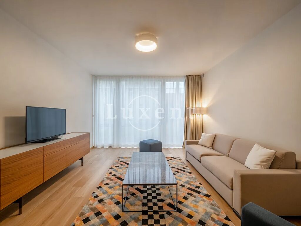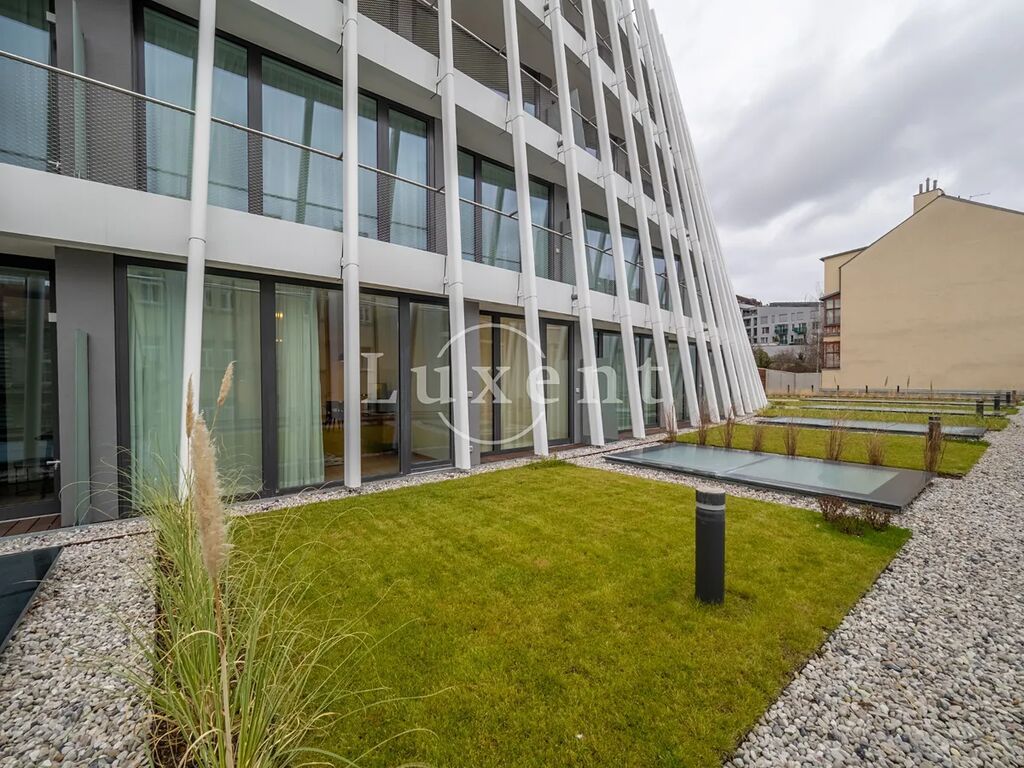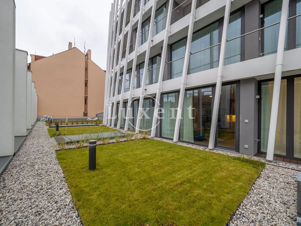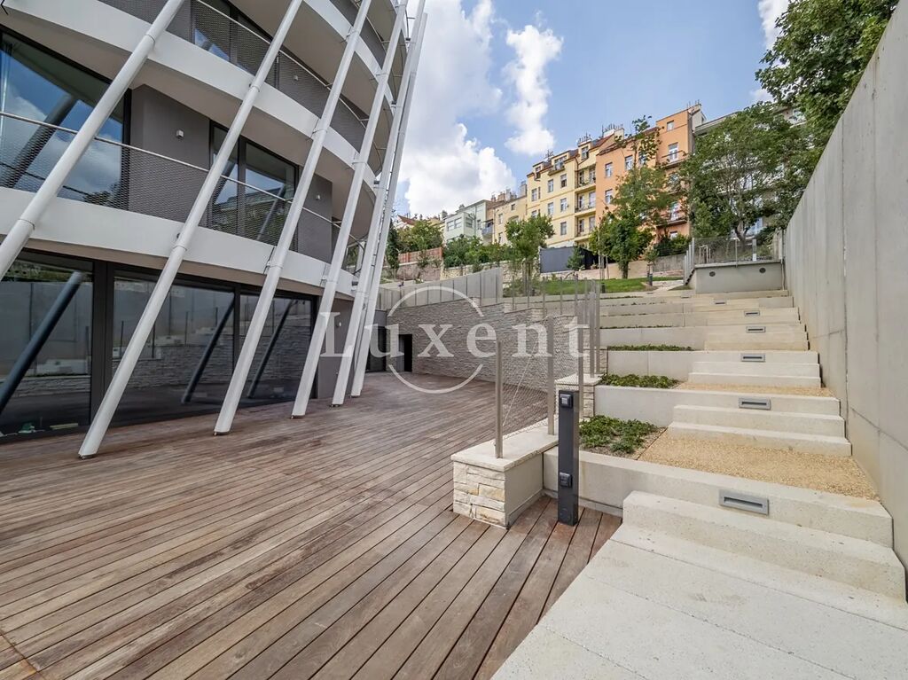 Nabízíme k pronájmu kompletně zařízený klimatizovaný byt 2+kk o užitné ploše 114 m2 s terasou a zahradou ve 2. patře novostavby rezidenčního projektu na Praze 5 - Smíchov. Budova s výtahem poskytuje mnoho nadstandardních doplňkových služeb jako je recepce, bazén, wellness za příplatek, Prisma institut fitness a rozlehlá společná zahrada v uzavřeném vnitrobloku. Za příplatek lze pronajmout parkovací stání v podzemních garážích. Součástí nájmu je úklid dvakrát měsíčně včetně výměny ložního prádla a ručníků a také údržba předzahrádky.