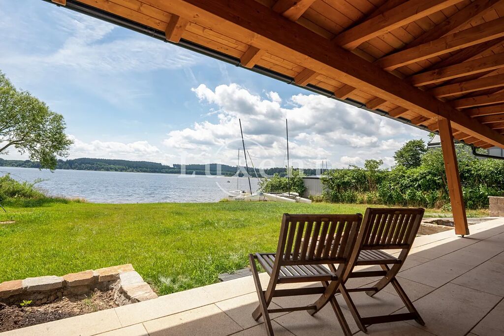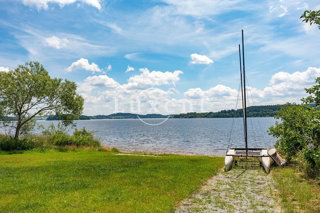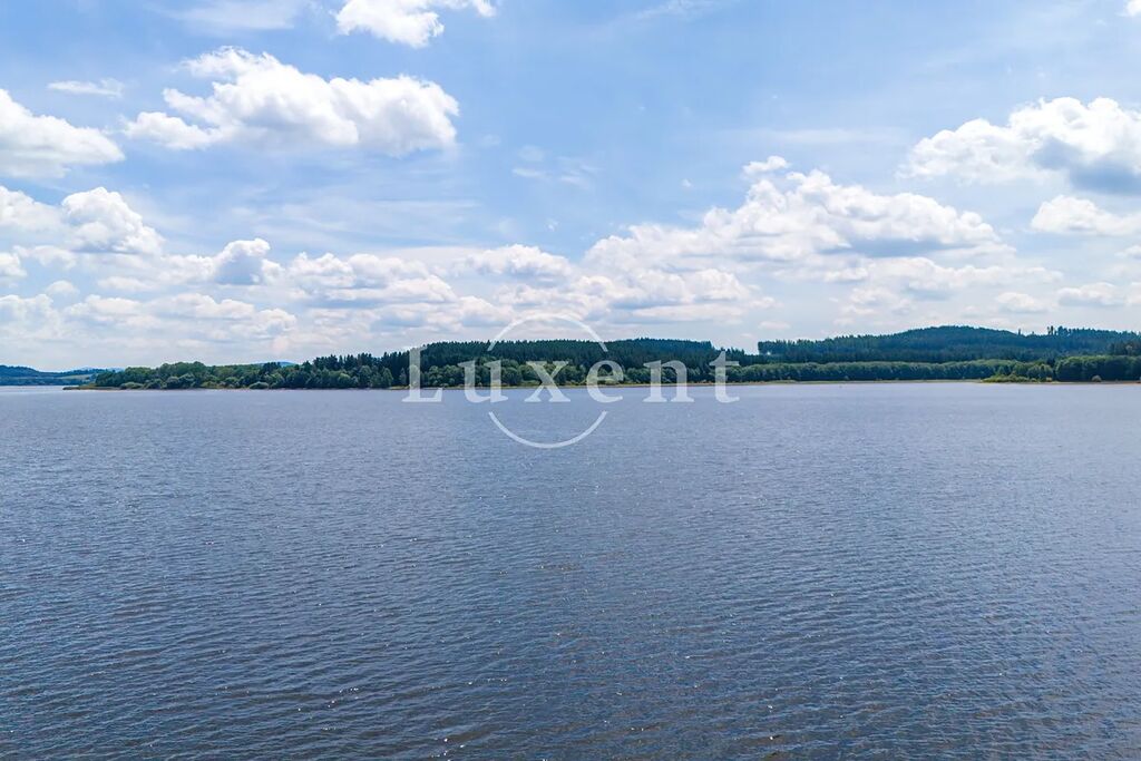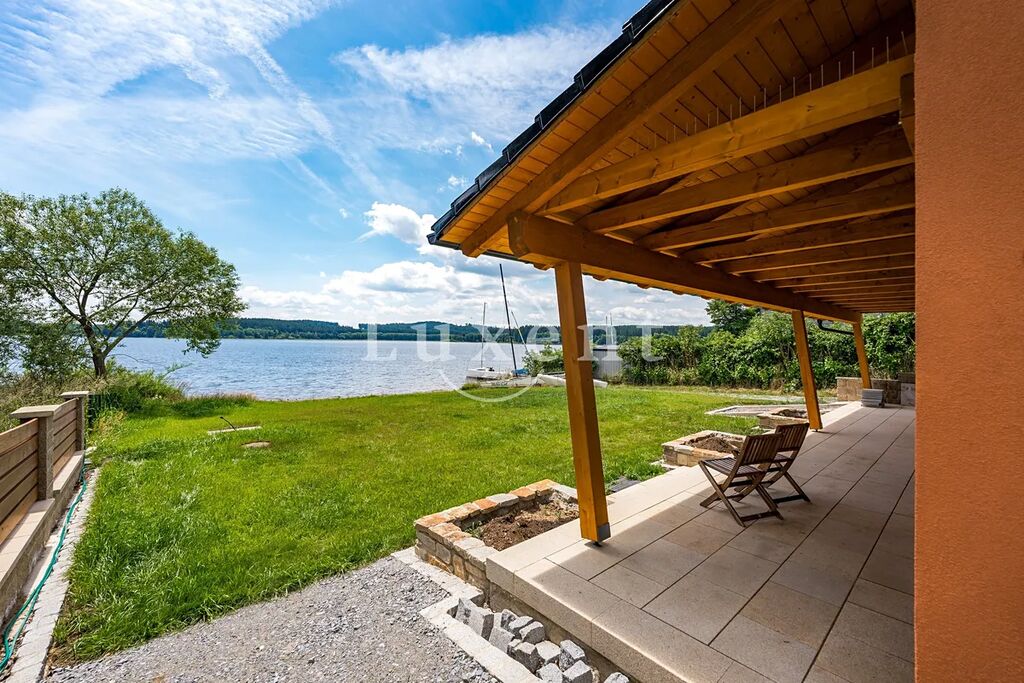Stylový dvoupatrový rodinný dům i vedlejší stavba byly kolaudovány v říjnu 2024. Příjezd je z veřejné komunikace branou na el. pohon. Samotný RD s terasou (89 m2) stojí na vyvýšené straně pozemku a nabízí praktický interiér pro bydlení i rekreaci – zádveří s chodbou, obývací pokoj s kuchyní, krbovými kamny a výstupem na terasu, v každém patře koupelnu a ve 2. NP dvě ložnice. Z terasy v přízemí i z podkroví jsou panoramatické výhledy na jezero (viz foto). Vedlejší stavba (97 m2) v jižní části pozemku je zapuštěna do svahu, má zelenou střechu s uchvacujícím výhledem a po celé délce zastřešenou terasu opět na jezero. Součástí prostorné přízemní stavby je loděnice/kolárna, 2 víceúčelové místnosti s krbovými kamny, sauna v přípravě, koupelna a technická místnost s TČ a dalším technologickým zázemím včetně FVE pro oba domy.