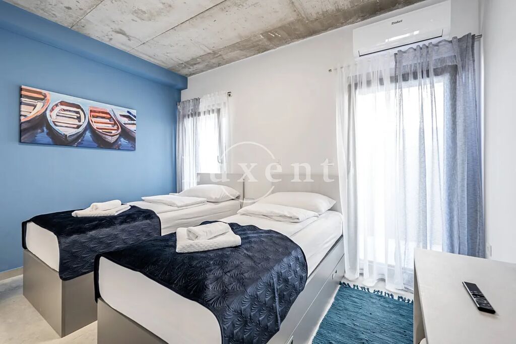 Vila se rozkládá na pozemku o velikosti 581 m2 a nabízí obytnou plochu 316 m2 rozvrženou do dvou podlaží. V přízemí se nachází čtyři prostorné ložnice, každá s vlastní koupelnou, dále obývací prostor s kuchyní, samostatná koupelna, wellness a sauna. V horním patře se nachází další obývací zóna, kuchyně s jídelnou, toaleta a prádelna. Tato výjimečná nemovitost z roku 2022 spojuje špičkový design, vysoký komfort a mimořádné umístění s otevřeným výhledem na moře, který je umocněn kaskádovitou polohou domu.