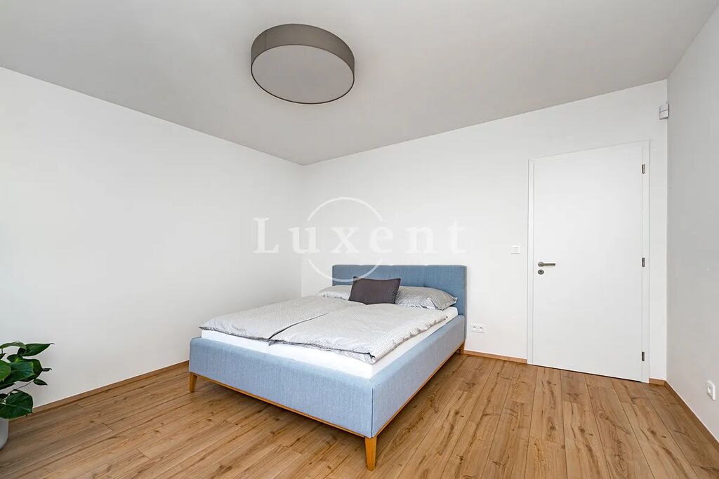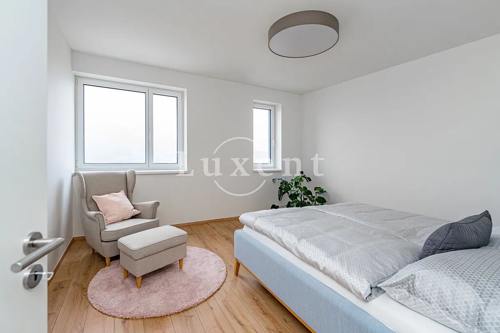 V přízemí domu je předsíň, koupelna, prádelna, tech. místnost a pak obývací pokoj příjemně prosklený do zahrady a na terasu. Je zde též integrovaná garáž s přípravou pro dobíjecí stanici. V patře je pak hlavní ložnice s vlastní koupelnou a šatnou, dva dětské pokoje s druhou koupelnou a úložná komora. Chodba nad schodištěm je prosvětlena světlíkem s přípravou pro el. pohon. Více viz přiložené půdorysy. Na podlahách je kvalitní laminátová plovoucí podlaha (dekor dle domu) a keramická dlažba. Vybavení koupelen: Villeroy & Boch.