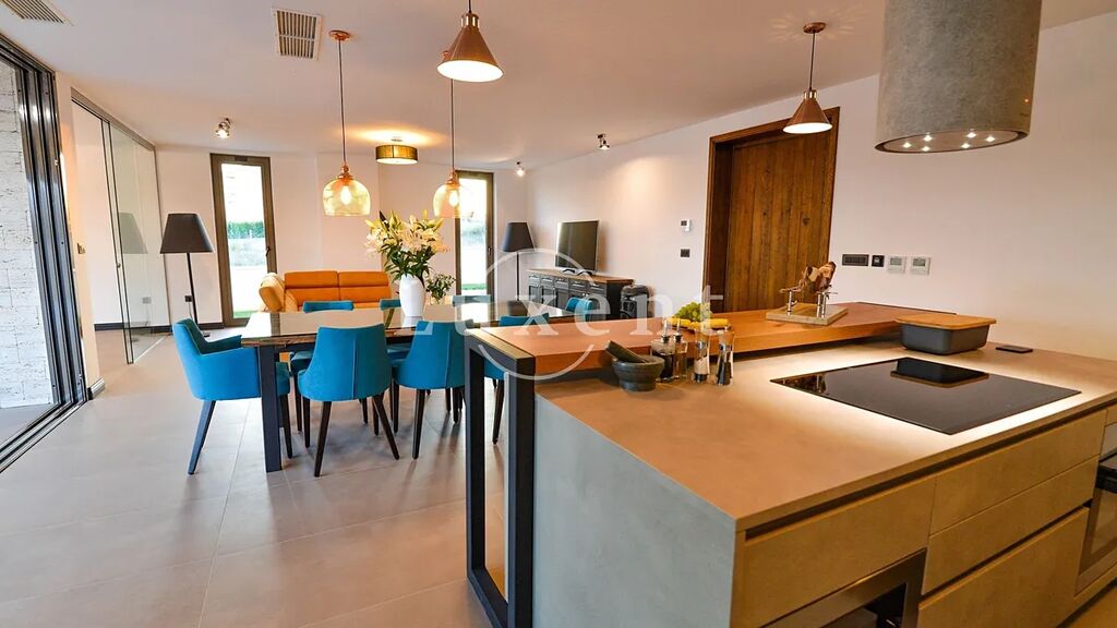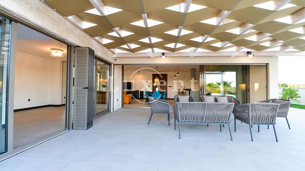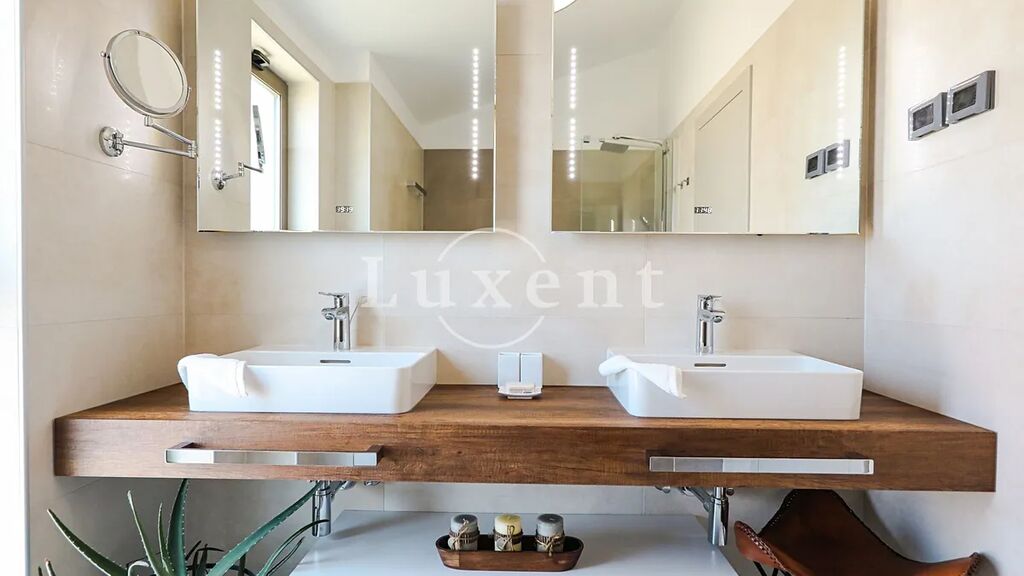 Hlavní obytnou část tvoří elegantní vila s prostorným interiérem, ve kterém se nacházejí tři ložnice, pět koupelen, moderně vybavená posilovna, relaxační sauna a vířivka. Centrem exteriéru je soukromý bazén obklopený sluneční terasou a venkovním krbem – ideální prostor pro odpočinek i společenské chvíle.