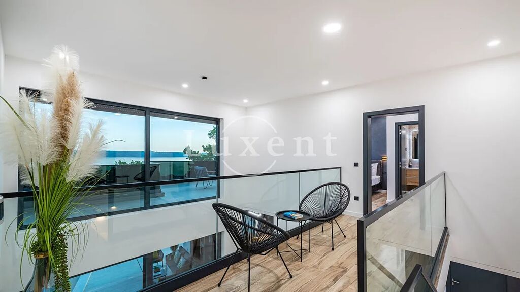 Nabízíme k prodeji elegantní vilu, která se nachází na pozemku o rozloze 622 m² a nabízí 256 m² obytné plochy. Nemovitost je rozložena do dvou podlaží a pyšní se moderním designem, čistými liniemi a velkými prosklenými stěnami, které poskytují úchvatný výhled na moře z každé místnosti.