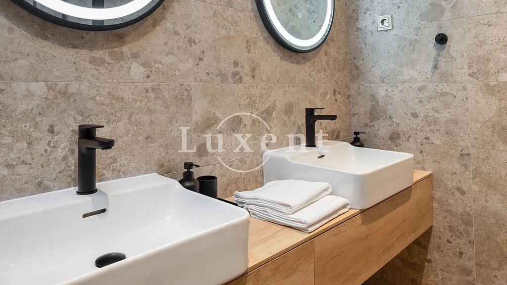 Vila disponuje celkovou obytnou plochou 310 m2 a je situována na prostorném pozemku o výměře 7 000 m2. Skládá se ze dvou nadzemních podlaží a je rovněž podsklepená. V přízemí se nachází moderně vybavená kuchyně s jídelnou, prostorný obývací pokoj s výhledem na venkovní část a jedna koupelna. První patro nabízí pět ložnic, z nichž každá má svou vlastní koupelnu, což zajišťuje maximální soukromí a komfort.