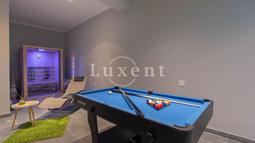 V přízemí vily se nachází wellness zóna se saunou, vířivkou a přímým vstupem k velkému vyhřívanému bazénu o rozloze 33 m2, který je obklopen prostornou sluneční terasou a zelení. Druhé podlaží nabízí komfortní ložnici s vlastní koupelnou, plně vybavenou kuchyň s jídelním koutem a prostorný obývací pokoj. Z něj se francouzskými okny vstupuje na venkovní terasu, odkud se otevírá úchvatný panoramatický výhled na moře a okolní přírodu. Třetí podlaží je navrženo jako klidová zóna se čtyřmi samostatnými ložnicemi, každá s vlastní koupelnou, což zajišťuje absolutní pohodlí pro větší rodinu nebo skupinu hostů.