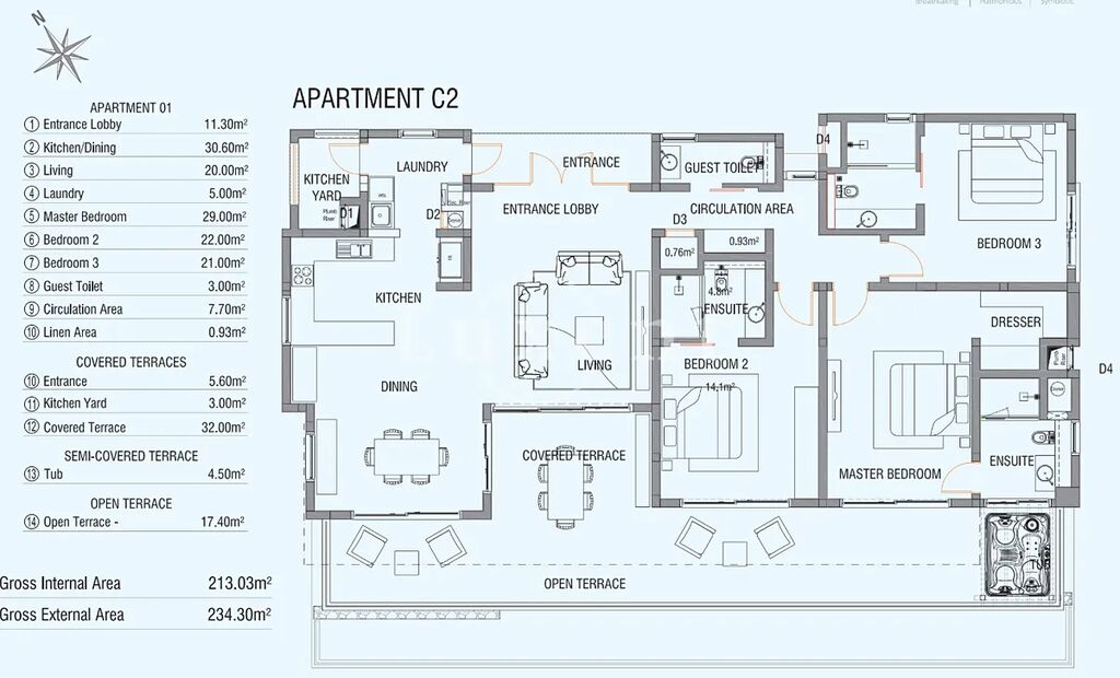 Dispozice bytu o obytné ploše 151 m2 zahrnuje tři ložnice s vlastními koupelnami (29 m2, 22 m2, 21 m2), obývací pokoj (20 m2) s kuchyní a jídelnou (31 m2) s velkými arkýřovými okny, skrze které se dostanete na prostornou terasu (54 m2), která je z části zastřešená. Součástí bytu je také prádelna (5 m2), toaleta pro hosty (3 m2), kuchyňský dvorek (3 m2), chodba (8 m2) a vstupní hala (11 m2). K tomuto apartmánu také patří dvě parkovací stání.