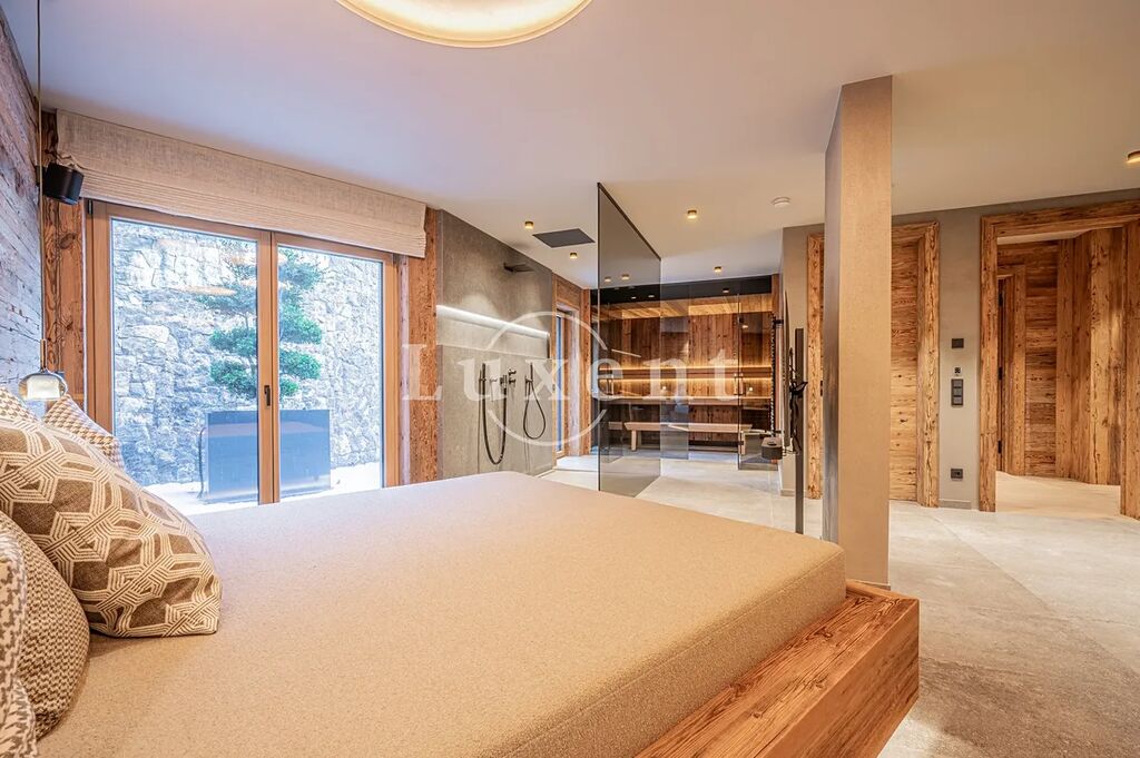 Horní patro nabízí prostorný obývací, jídelní a kuchyňský kout s vysokým stropem a velkými okny, které umožňují nádherný výhled na okolní hory. Kvalitní kuchyně je vybavena spotřebiči Miele, Bora a Qooker, což zaručuje prvotřídní zážitek z vaření. V přízemí se nachází luxusní hlavní ložnice s vlastní koupelnou a šatními skříněmi. Další dvě ložnice v suterénu jsou zařízeny exkluzivním nábytkem a mají vlastní koupelny.
