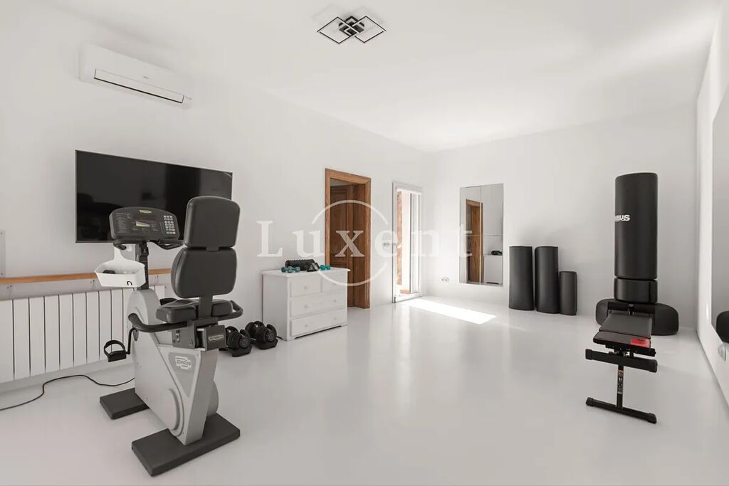 Vila je dvoupodlažní a pyšní se elegantně navrženými velkorysými prostory. V prvním podlaží se nachází moderní kuchyně vybavená špičkovými spotřebiči značky Neff, která navazuje na snídaňový a jídelní kout s panoramatickými okny s překrásným výhledem na otevřené moře. Z velké terasy si můžete vychutnávat fascinující západy slunce. Jsou zde čtyři prostorné ložnice, z nichž každá má vlastní koupelnu. Dále je zde i toaleta pro hosty. Koupelny jsou vyzdobeny mallorskými kameny. Nemovitost vyvolává pocit čistoty a vytříbeného vkusu, v němž se snoubí moderní luxus s půvabem středomořské estetiky. Budova disponuje klimatizací a podlahovým vytápěním. Součástí vily je také posilovna.