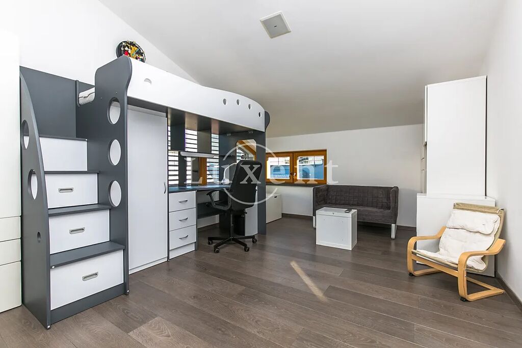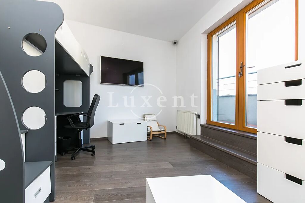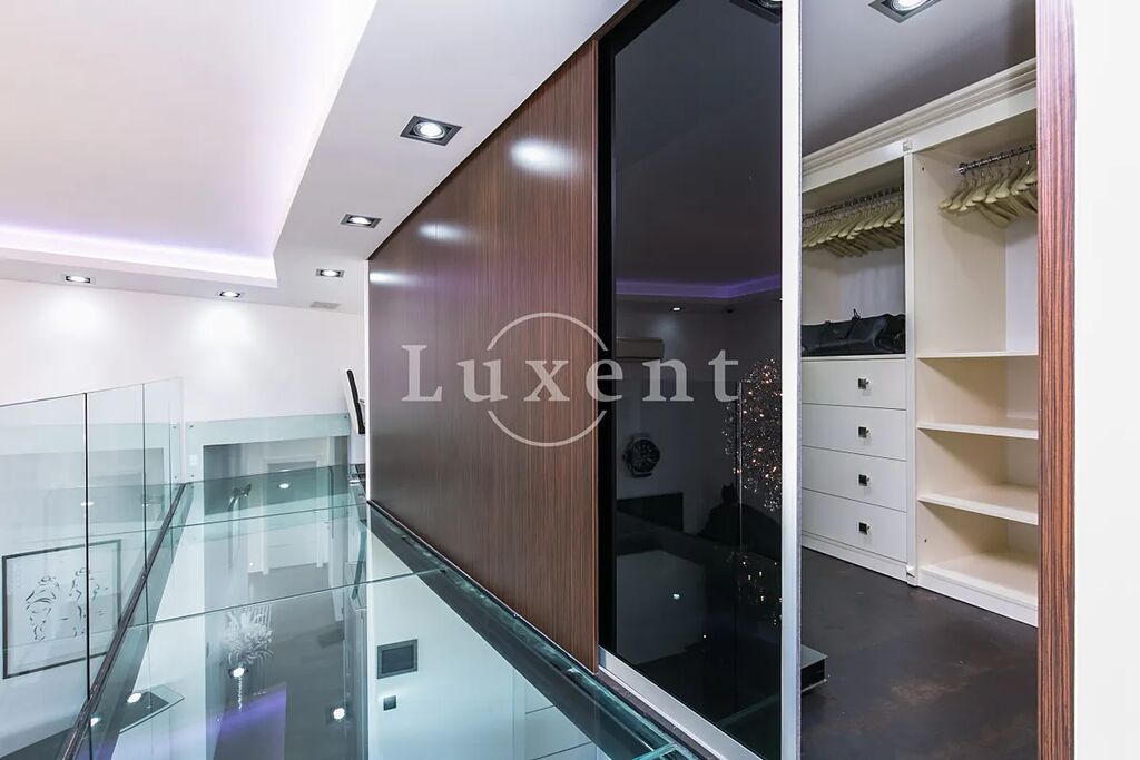 Nabízíme k prodeji působivý nadstandardně vybavený mezonetový byt, který je součástí a zároveň korunou architektonicky neobvyklé novostavby. Umělecky zpracovaná stavba připomínající loď se nachází v poklidné rezidenční části Barrandova. Nabízený byt o obytné ploše 210 m2 je umístěn v posledním patře a jeho součástí jsou i dvě terasy o velikosti 230 m2, připomínající příď a lodní palubu, s nádherným výhledem na Prokopské údolí. Jedna z teras je orientována na sever, její součástí je posilovna, sprcha, solárium a vířivka. Druhá terasa je orientována na jih a nachází se zde letní posezení s kuchyní a grilem. Dispozice bytu zahrnují vstupní chodbu, tři samostatné ložnice, dvě koupelny s toaletou a samostatné WC. Dále prostorný parciálně prosklený obývací pokoj s jídelním stolem, plně zařízenou kuchyní a barem. Z obývacího pokoje vede schodiště na galerii s manželskou postelí, TV, šatnou a pracovnou. Interiér doplňuje mnoho uměleckých děl a soch.