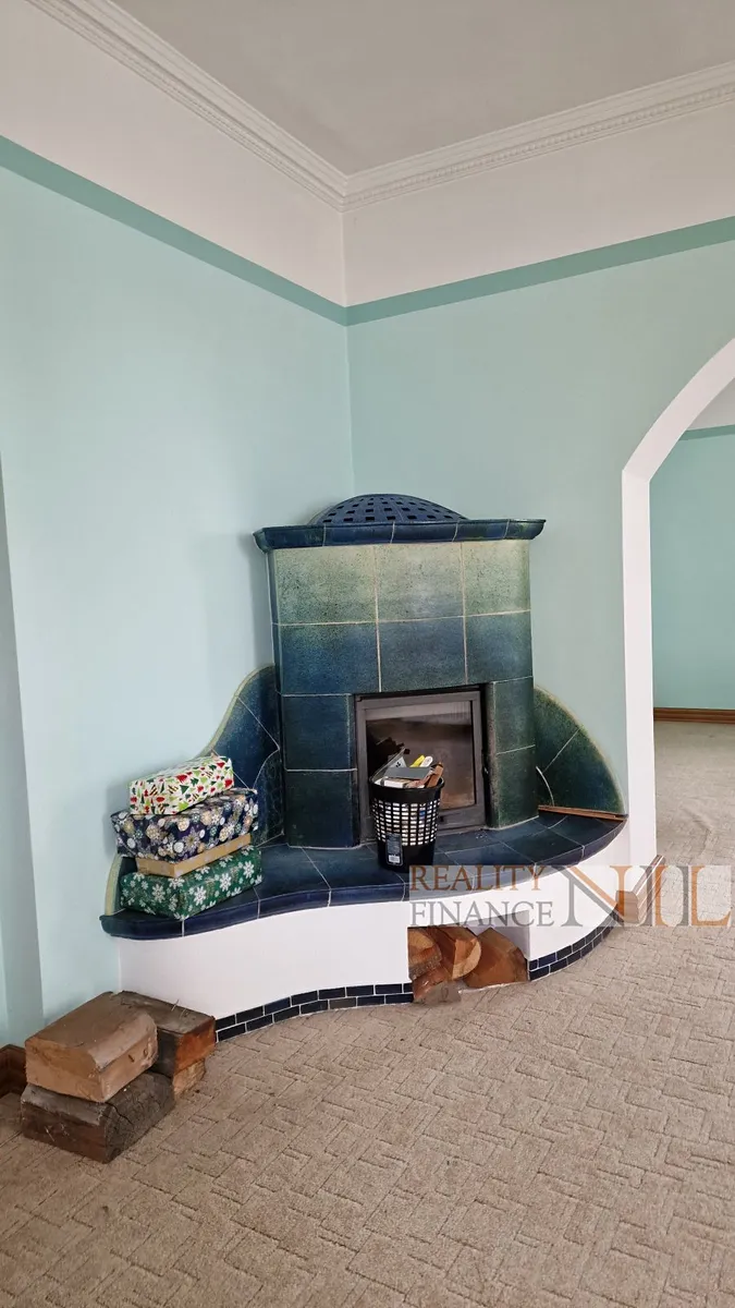 1. NP: 3 pokoje, kuchyně s výstupem na zahradu, koupelna a WC v suterénu, v obývacím pokoji jsou velká krbová kamna