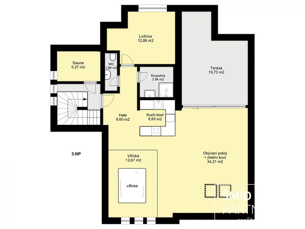 4. Nadstandardní byt o 90 m2 v podkroví s velkou terasou 20 m2 a saunou