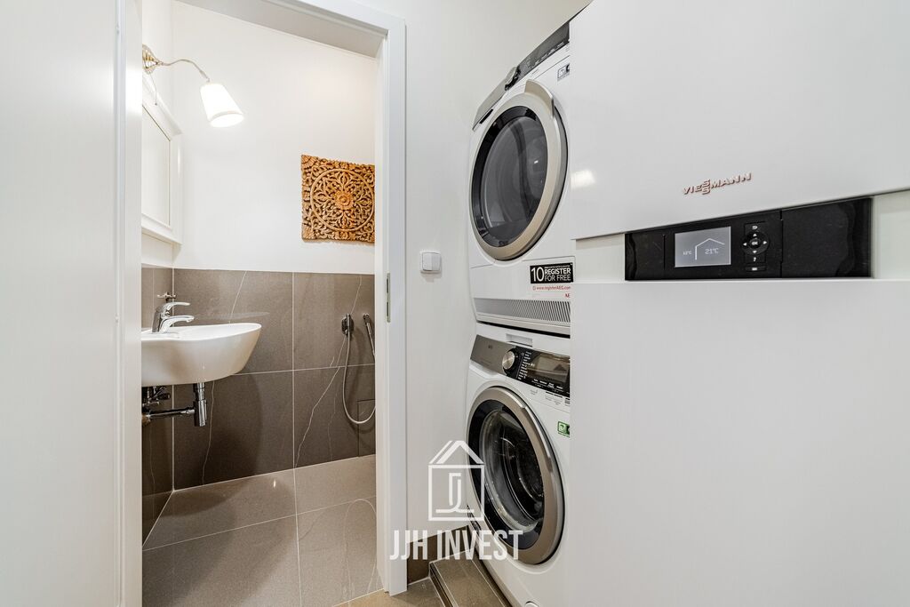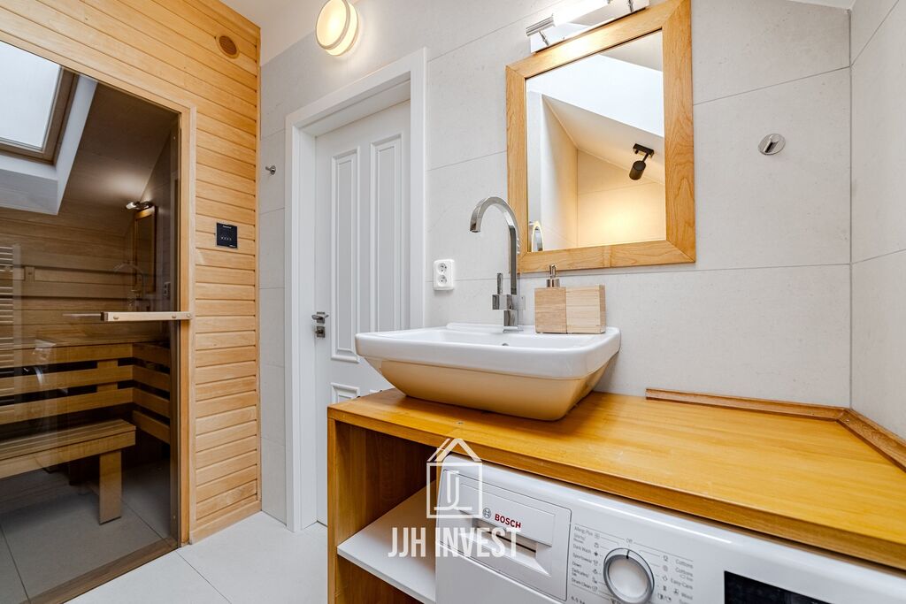 V horním patře jsou dvě ložnice, druhá koupelna, praktická kuchyňka a otevřený kout vhodný pro home office, hernu nebo relaxační zónu. Byt je klimatizovaný, vybavený kvalitními spotřebiči a nábytkem na míru. V celém interiéru byly použity nadstandardní materiály, které podtrhují elegantní design. Součástí bytu je také sauna k příjemnému trávení dlouhých zimních večerů.