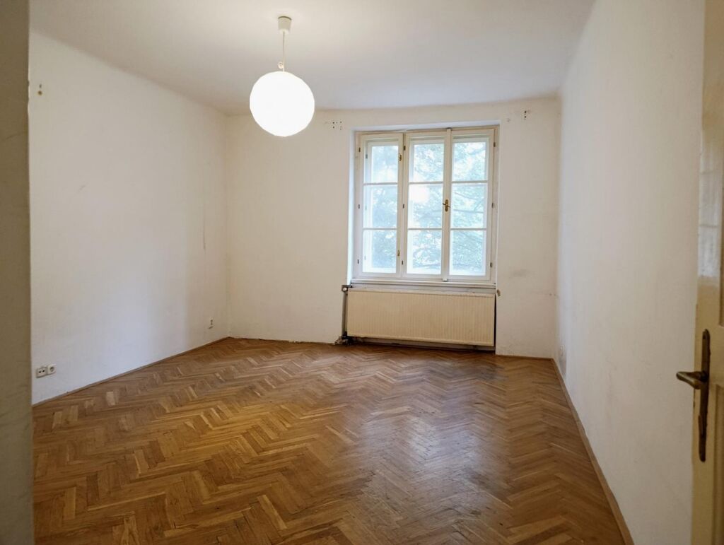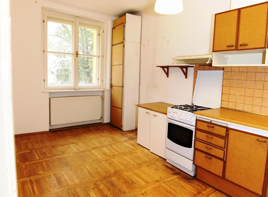 Byt je neadaptovaný, vhodný k rekonstrukci, avšak plně funkční a v případě investiční koupě jej lze s nevelkým nákladem obratem pronajímat. Praktická dispozice bytu zahrnuje předsíň se vstupem do všech ostatních místností bytu, samostatnou kuchyň, obývací pokoj, ložnici, koupelnu společnou s WC a malou komoru. K bytu náleží zděná sklepní kóje v suterénu. Standardem bytu jsou špaletová okna (s orientací na jih do dvora a na sever do klidné ulice), starší kuchyňská linka s kombinovaným sporákem, původní dřevěné dveře do dřevěných zárubní, dřevěné parkety v pokojích a kuchyni a keramická dlažba v předsíni a koupelně, vana, kombi WC, starší plynový kotel (vytápění, ohřev vody).