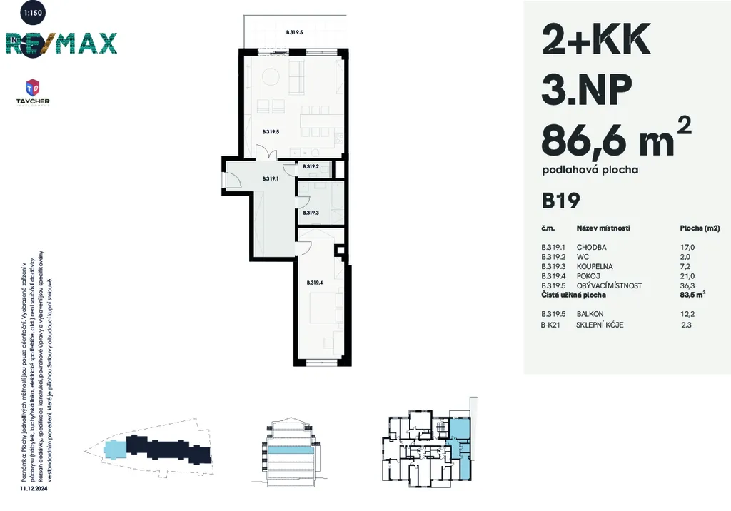 Nabízíme byt B19, 2+KK o celkové ploše 86,6 + 12 m²(balkon), který se nachází ve 3.NP. Byt disponuje velkou vstupní chodbou s možností umístění vestavných skříní. Stejně jako v ostatních bytech je WC odděleno od koupelny. Byt má velkou obytnou místnost s kuchyní (36,3 m2) a přímým vstupem na terasu a prostornou ložnici. V přiloženém půdorysu máte možnost si prohlédnout dispozici bytu, která odpovídá všem moderním standardům. Byt bude standardně vybaven dřevěnou podlahou a v koupelně a WC velkoformátovou moderní dlažbou. Finální materiály je možno samozřejmě s developerem individuálně řešit. Součásti prodejů je sklep o velikosti 2,5 m2.