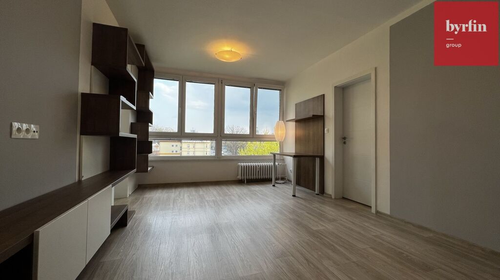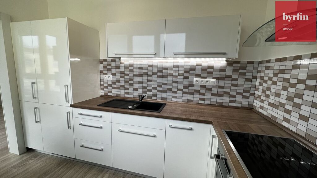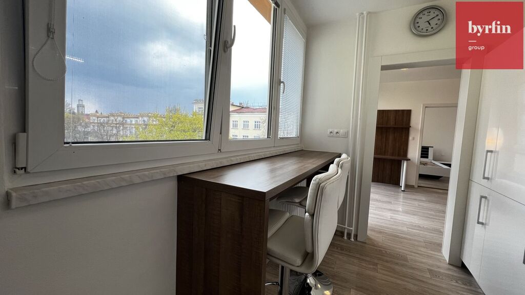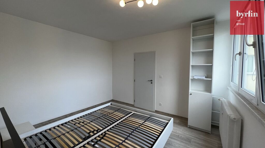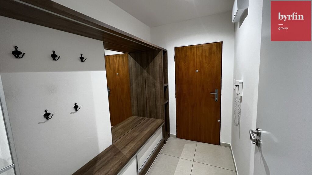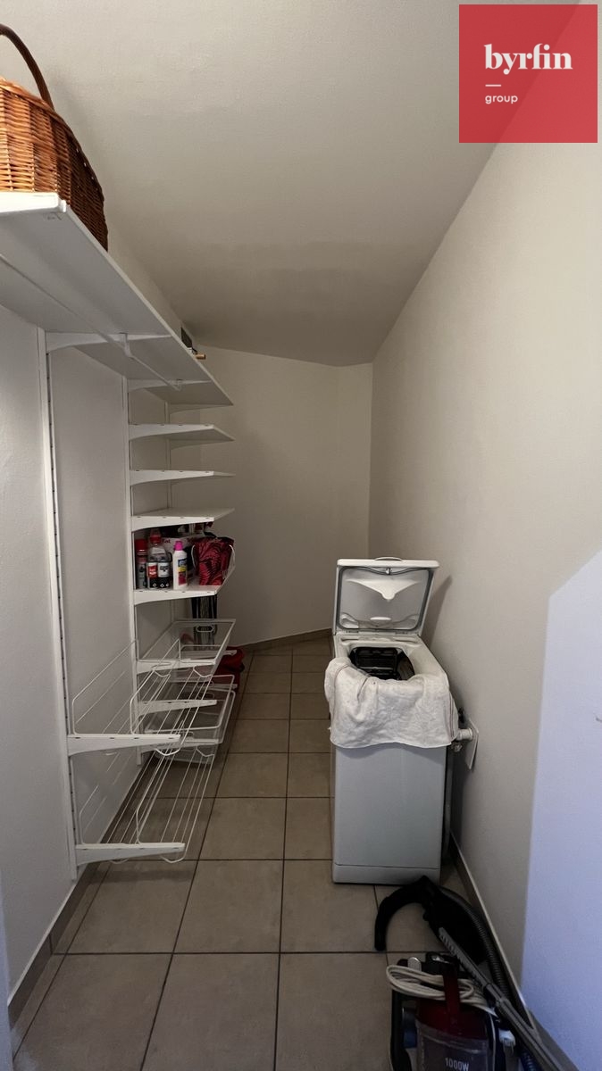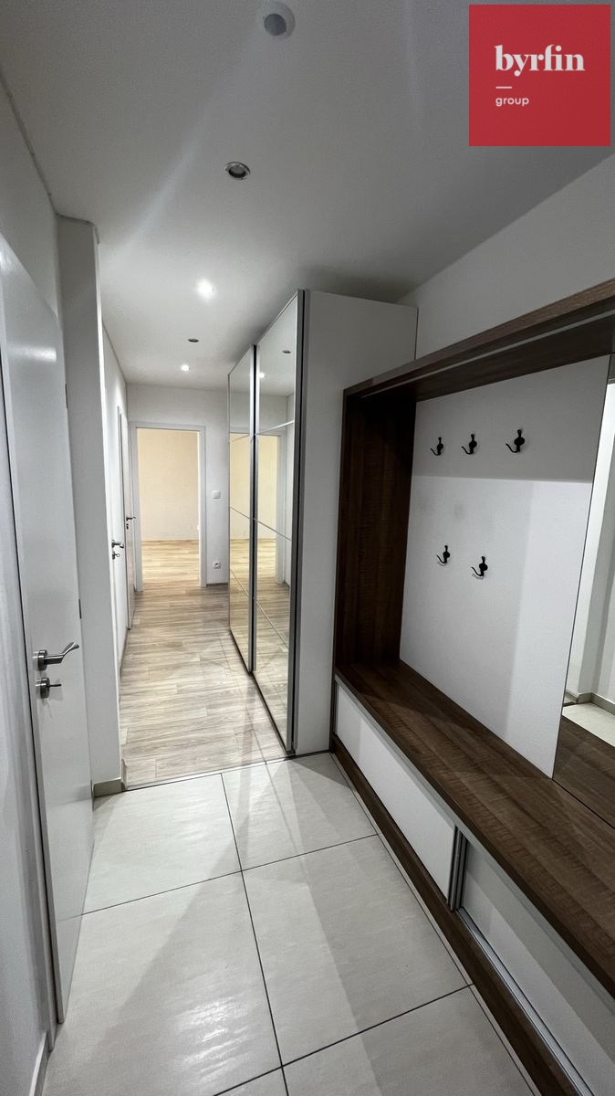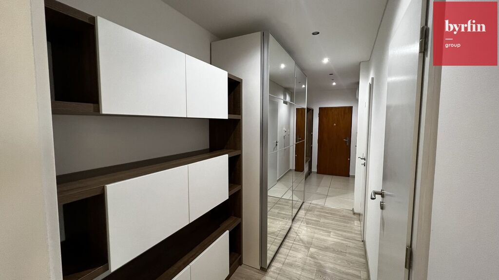 V předsíni nalezneme vestavné skříně na míru s velkým množstvím úložných prostor, v obývacím pokoji je televizní nábytek a pracovní stůl - vše designově sladěno, v ložnici je k dispozici manželská postel (bez matrace) s nočními stolky a skříňka. Kuchyně nabídne moderní kuchyňskou linku vč. kompletního vybavení vestavnými spotřebiči a barový jídelní stůl s židlemi. Velkou výhodou je komora přímo v bytě, ve které se nachází pračka a šatní systém. Byt je připraven k nastěhování během října/listopadu. Majitelé preferují slušné a pracující nájemníky bez exekucí, bez domácích mazlíčků, s preferencí nekuřáků.