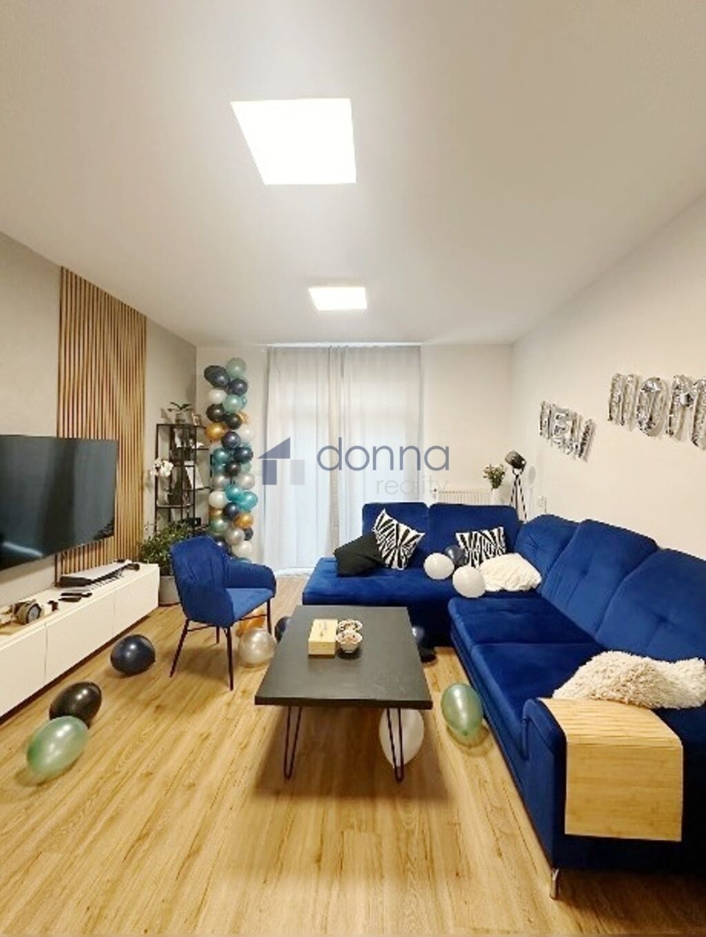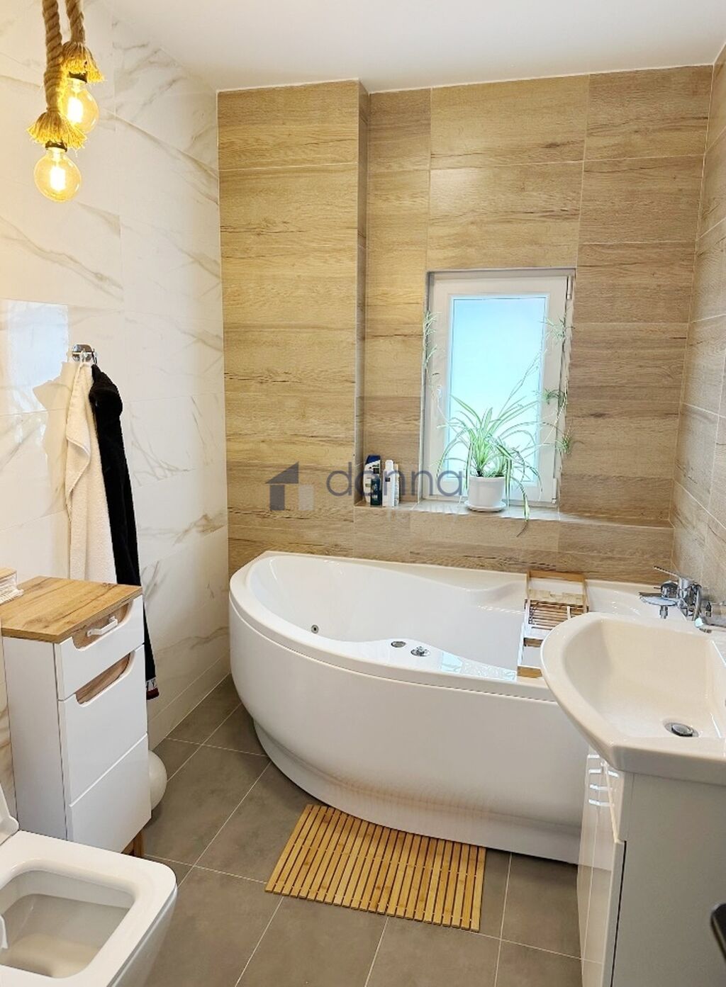 První patro: koupelna s hydromasážní vanou a toaletou, ložnice, šatna spojená s druhým soukromým obývacím pokojem a dále volný pokoj.