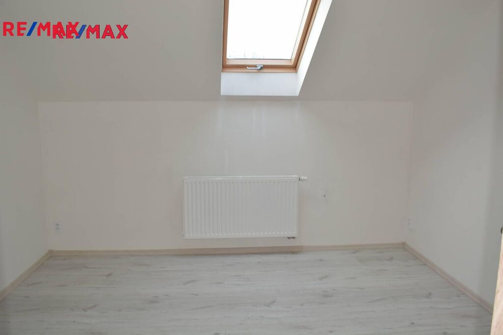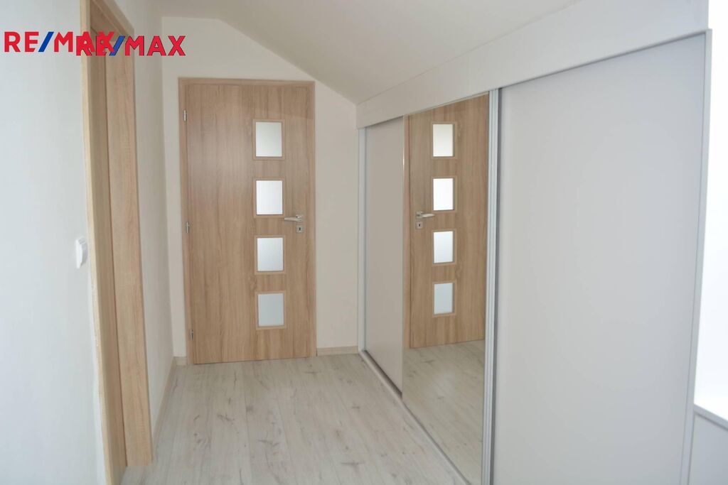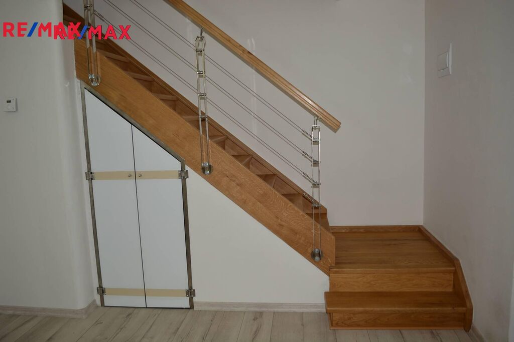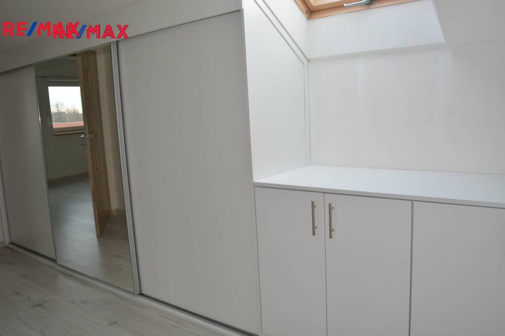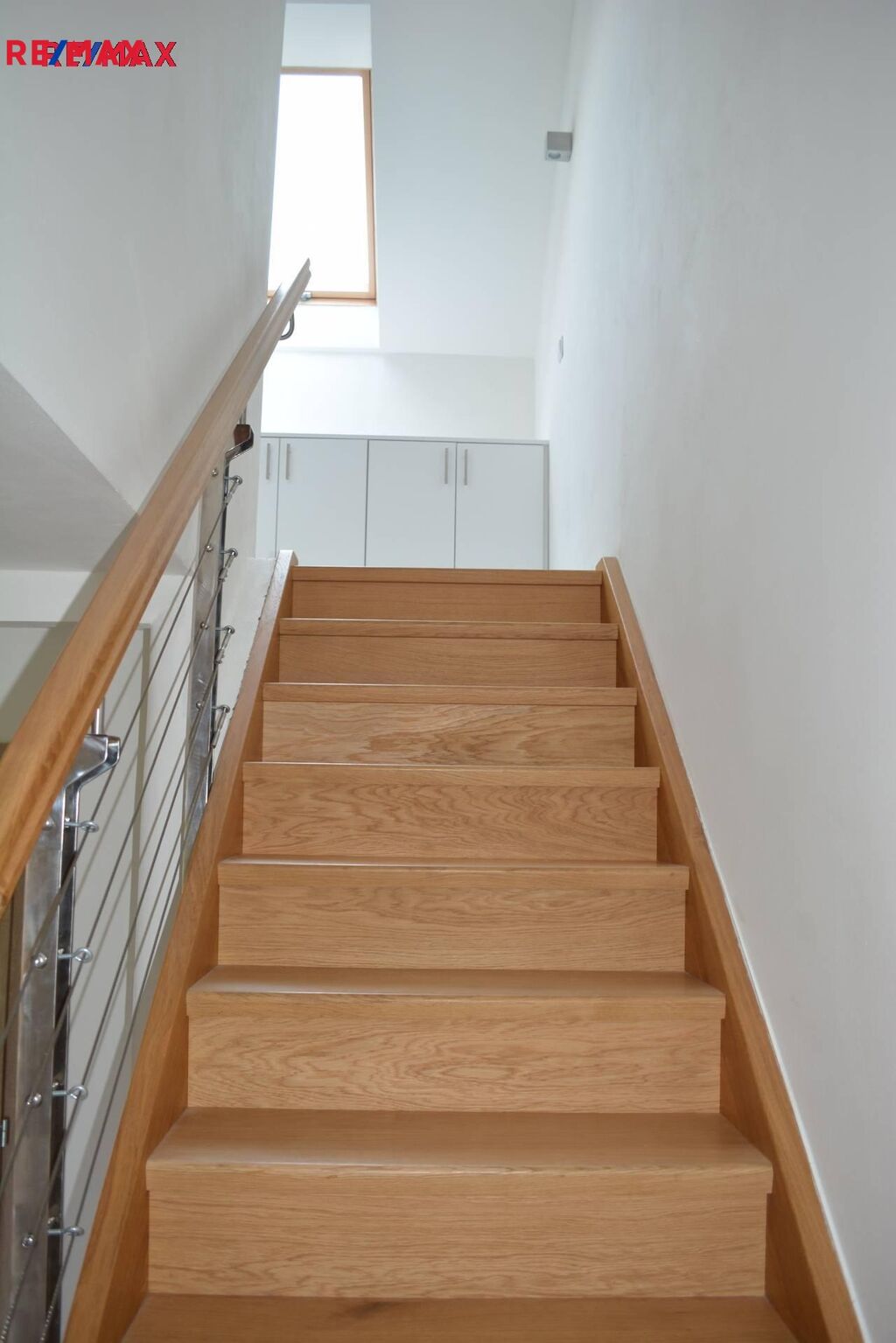 Vstup do patra domu je řešen dřevěným schodištěm, na chodbě se nachází vestavěné úložné prostory a k dispozici jsou dva pokoje.