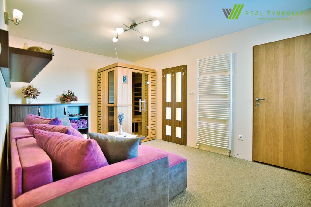 Obytné podkroví je zasvěceno odpočinku a práci: Zde naleznete dva prostorné dětské pokoje s výstupem na uzavřený balkon (lodžii), samostatnou pracovnu a další pokoj se saunou, která Vám zajistí odpočinek po náročném dni v práci. Odpočinek podtrhne i relaxační koutek s posezením a výhledem do zahrady.