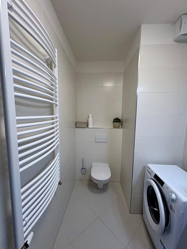 koupelna s vanou, umyvadlem, toaletou a otopným žebříkem
