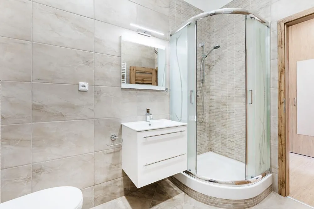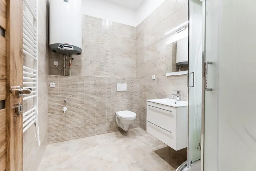 Koupelna se sprchovým koutem, umyvadlem, osvětleným zrcadlem, přípojkou na pračku, topným žebříkem a WC geberit