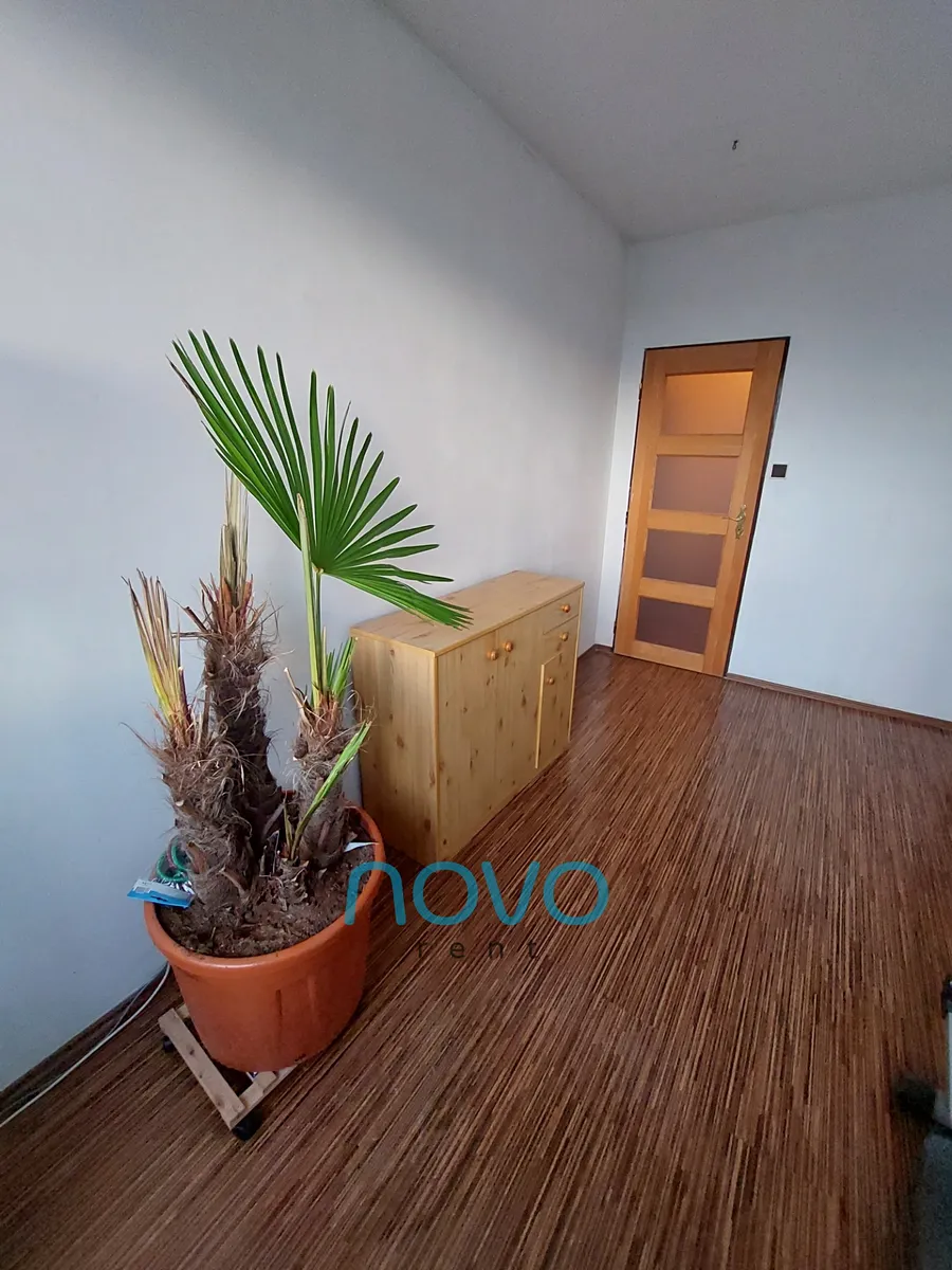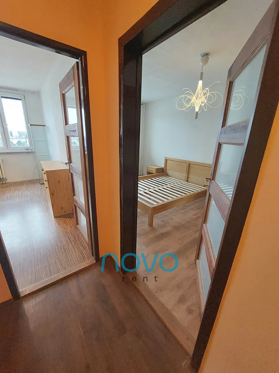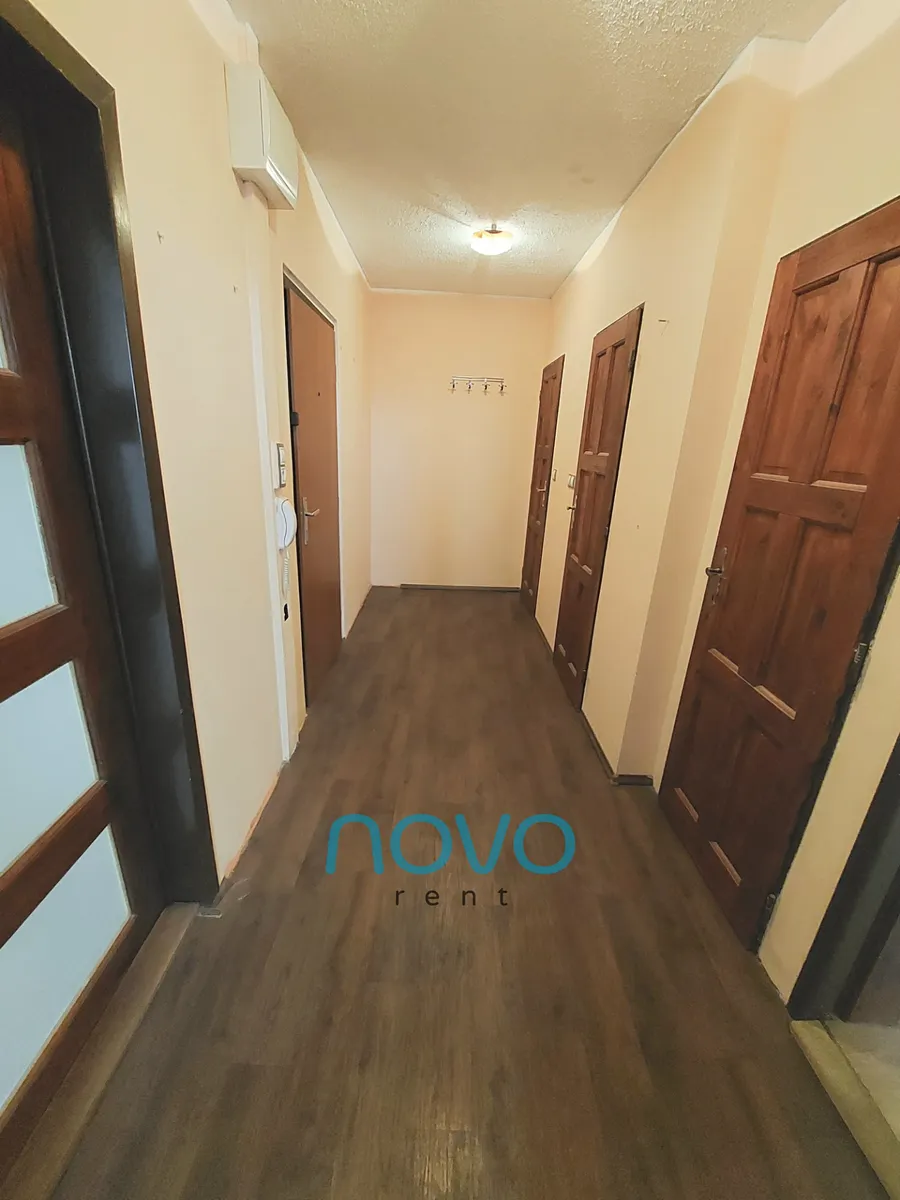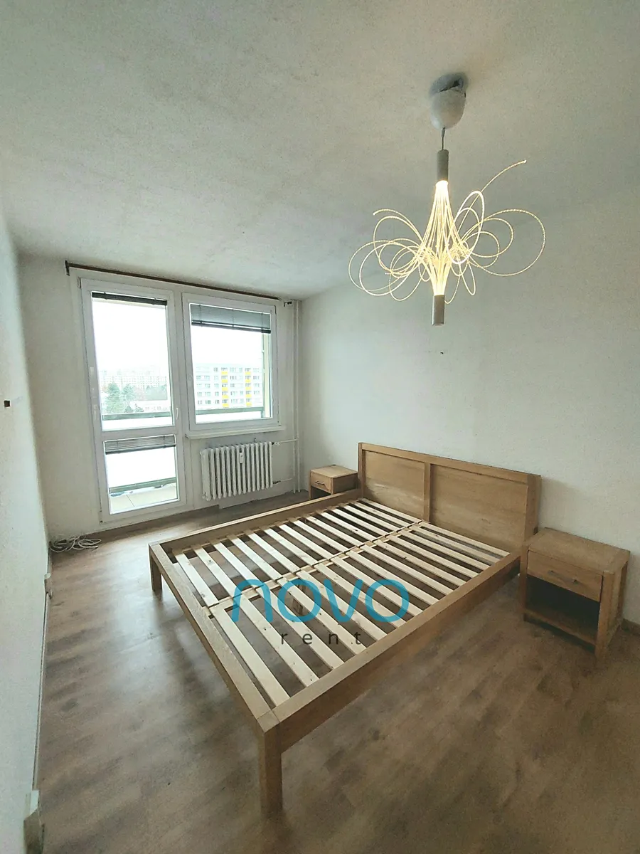 Po vstupu do bytu se nachází prostorná chodba se samostatnou toaletou, koupelnou se sprchovým koutem. Odděleně je též samostatná komora o rozloze 2x2 m. Z chodby se dostanete do 3 samostatných pokojů. První po pravé straně lze využít jako ložnici. Zde se nachází manželská postel s dvěma nočními stolky a roštem bez matrací. Oblečení si můžete uložit do prostorné šatní skříně. Z této místnosti je též vstup na balkón o velikosti 6 m2. Místnost sousedící s ložnicí můžete využívat jako pracovnu či samostatný pokoj. Tento pokoj vybavený není.
