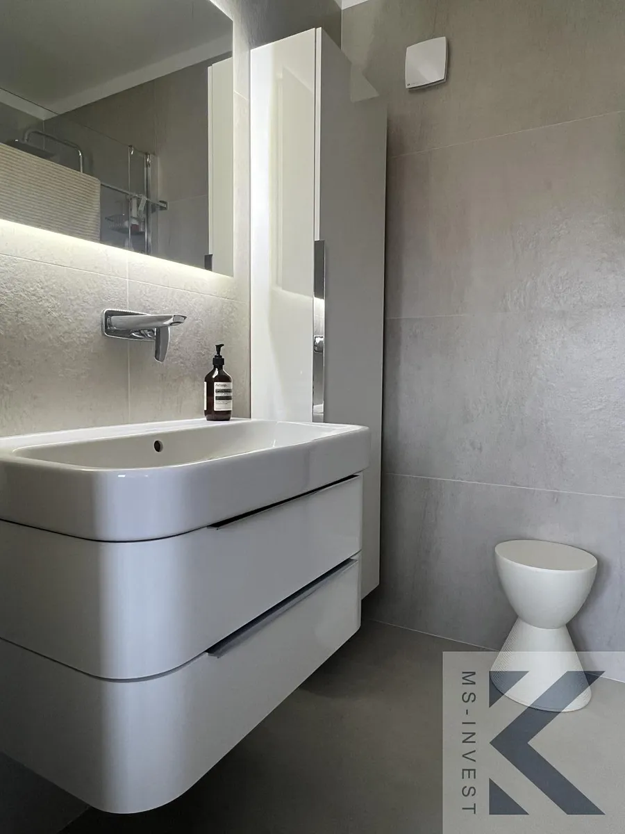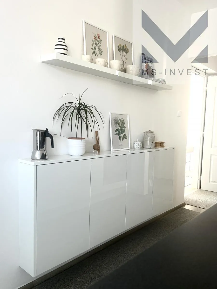Citlivě zrekonstruovaný byt s původními prvky se nachází ve druhém patře domu s výtahem a má podlahovou plochu 83 m2. Je tvořen třemi pokoji (dva velkorysé a jeden menší používaný jako ložnice) a praktickou kuchyní s jídelním koutem a přístupem na balkon. Byt je velmi dobře dispozičně řešen, má luxusní koupelnu se sprchovým koutem, samostatné WC, šatnu s vestavěnými skříněmi, technickou místnost a spíž. V přízemí domu se nachází společná místnost pro kola a kočárky a sušárna na větší prádlo, v suterénu domu pak samostatný sklep patřící k bytu. Zcela unikátní vzhledem k poloze v centru města jsou oplocené zahrádky patřící k domu, kde mají vlastníci bytů záhony s dostatkem prostoru pro pěstování bylinek a zeleniny, u domu je i menší pískoviště a posezení.