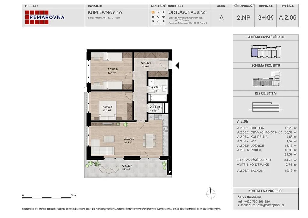 Nabízíme Vám k prodeji byt 3+kk 84 m2 s balkonem 15 m2 ve 2.NP v projektu REMAROVNA, který je umístěn v obytné zástavbě širšího centra města Písku, mezi ulicemi Pražská a V Portyči. Jedná se o historickou plochu bývalé strojírny a slévárny Remar, kde vzniklo novou výstavbou 53 bytových jednotek a 3 ateliéry o dispozicích 1+kk až 4+kk a velikostech od 32 m2 do 116 m2. Většina bytů disponuje balkonem, terasou, či předzahrádkou. Samozřejmostí je sklep ke každé jednotce. Bytový dům má 1 podzemní a 5 nadzemních podlaží a je rozdělený na dva samostatné vstupy se dvěma výtahy.