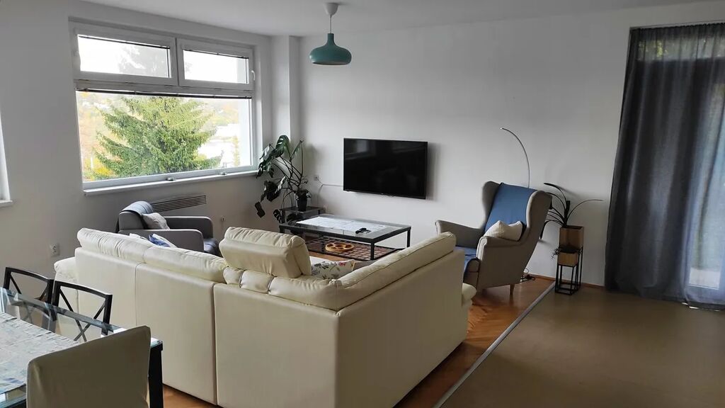 Nabízíme ke krátkodobému pronájmu (11/2025 - 4/2026) byt o dispozici 3+kk a výměře cca 100 m2, situovaný v prvním nadzemním podlaží budovy v atraktivní brněnské městské části Bystrc, na ulici Rakovecká. Z obývacího pokoje bytu je nádherný výhled na Brněnskou přehradu a do lesů ji obklopujících. Dispozičně byt sestává ze vstupní haly, tří samostatných/neprůchozích obytných místností a koupelny společné s wc, je kompletně vybavený (kuchyňská linka včetně všech spotřebičů, rozkládací rohová kožená sedačka, jídelní stůl, židle.... vše co je na fotografiích ) a připraven k užívání. Součástí nájmu jsou dvě parkovací stání a prostorná oplocená terasa ("předzahrádka") lemující vnější rohovou část bytu, určena výhradně pro potřeby uživatele bytu.