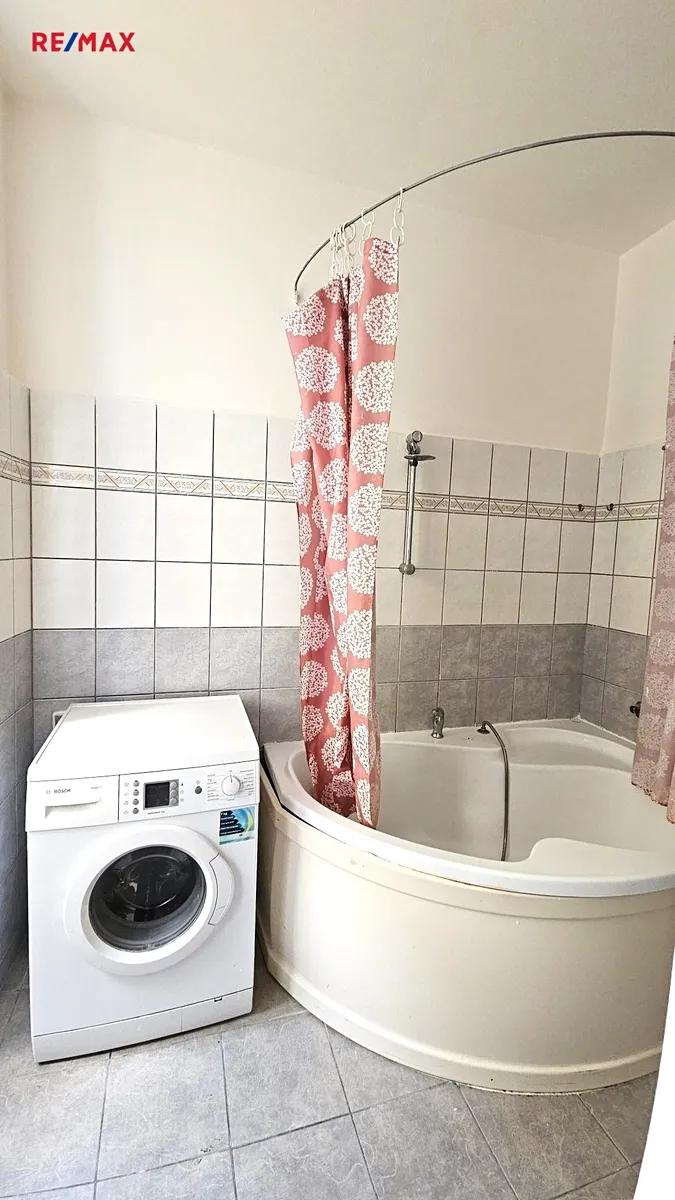 Koupelna je s rohovou vanou a toaletou. Vytápění a ohřev vody jsou ústřední etážové.