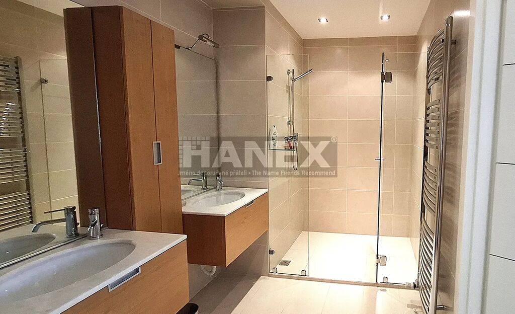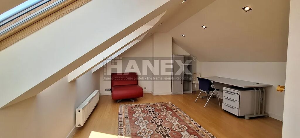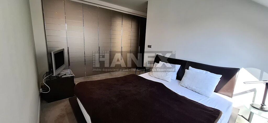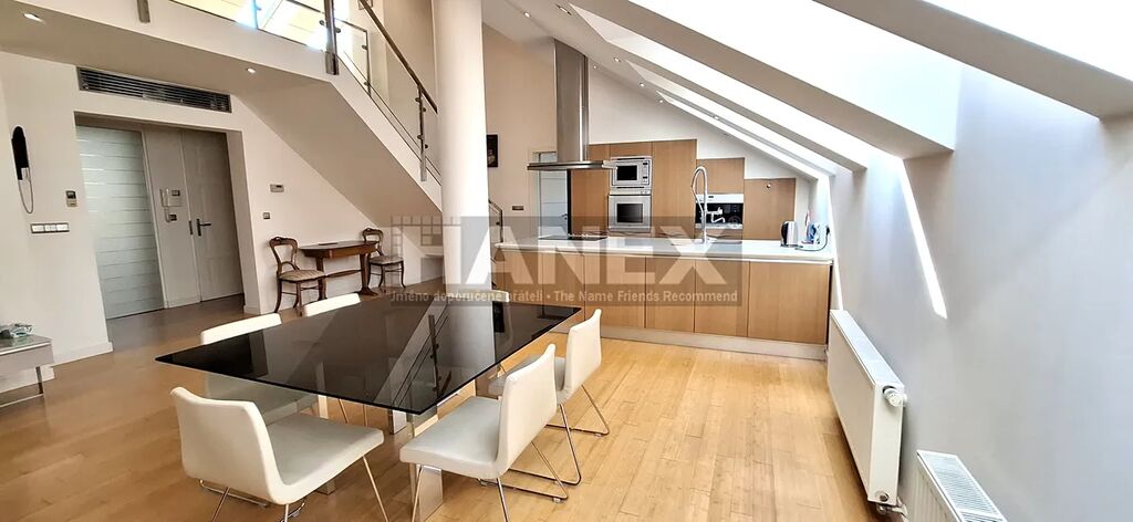 Atypický luxusně provedený mezonetový byt 4+1 o velikosti 185,59 m2 v atraktivní lokalitě jen pár kroků od Malé Strany. Byt se nachází v posledním 5. patře v klidné ulici na Smíchově v těsné blízkosti zahrady Kinských, Francouzského Lycea, nákupního centra Nový Smíchov a nábřeží Vltavy. Na hlavní úrovni bytu je prostorný obývací pokoj s kuchyňským koutem o velikosti 63,48 m2, 3 ložnice a 3 koupelny včetně 3 toalet. V patře je galerie, sauna a koupelna. Nadstandardně řešené vestavěné skříně. Klimatizace. Vlastní plynové vytápění. Orientace bytu západ a východ. Velmi komorní dům pouze s 6ti jednotkami.