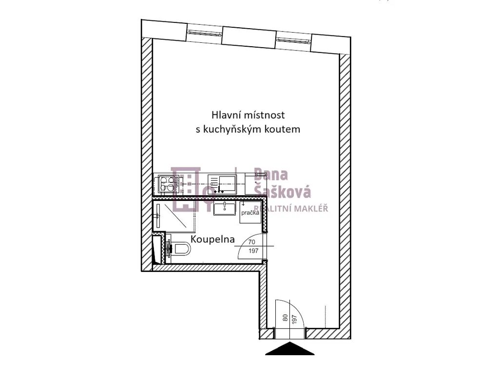 Podlahová plocha 35 m2 nabízí pokoj s kuchyňským koutem a koupelnu s toaletou a sprchovým koutem.