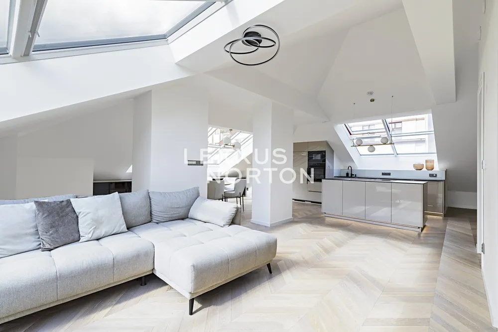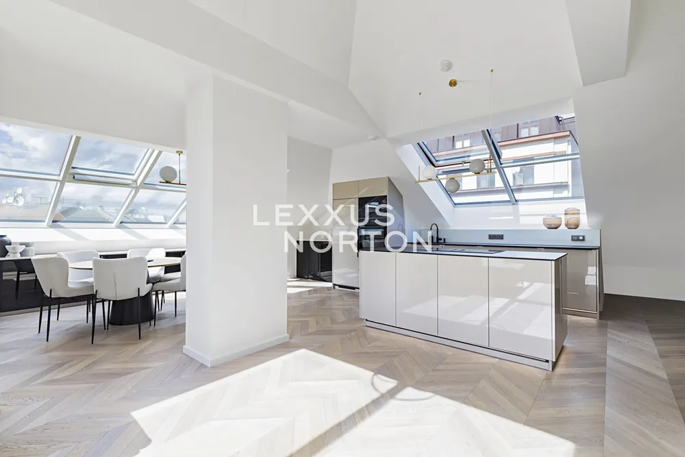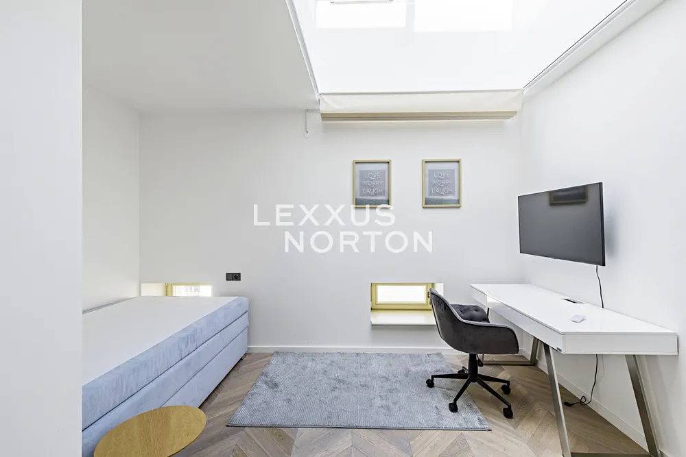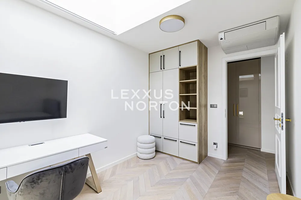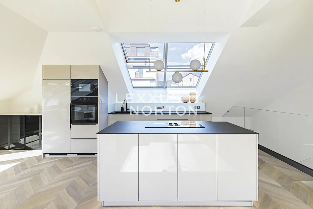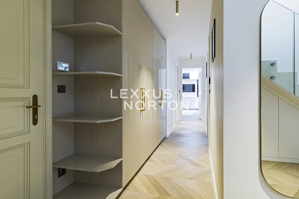 Tento klimatizovaný mezonet 4+kk k pronájmu se sestává ze dvou pater. Vstupní patro dispozičně nabízí chodbu s vestavěnými skříněmi, hlavní ložnici s vlastní koupelnou (sprchový kout, toaleta), další dvě ložnice, koupelnu (sprchový kout, toaleta) a komoru s pračkou a sušičkou. V horním patře se nachází prostorný obývací pokoj s krbem, plně vybaveným kuchyňským koutem (indukční varná deska, lednice, mrazák, mikrovlnná trouba, vinotéka,) včetně jídelního prostoru a samostatná toaleta. Součástí vybavení je klimatizace, bezpečnostní vstupní dveře a videotelefon. V ceně nájemného je zahrnuto užívání sklepu a parkovací stání ve dvoře včetně nabíjecí stanice pro elektromobily. Možnost pronájmu dalšího parkovacího stání za extra poplatek.