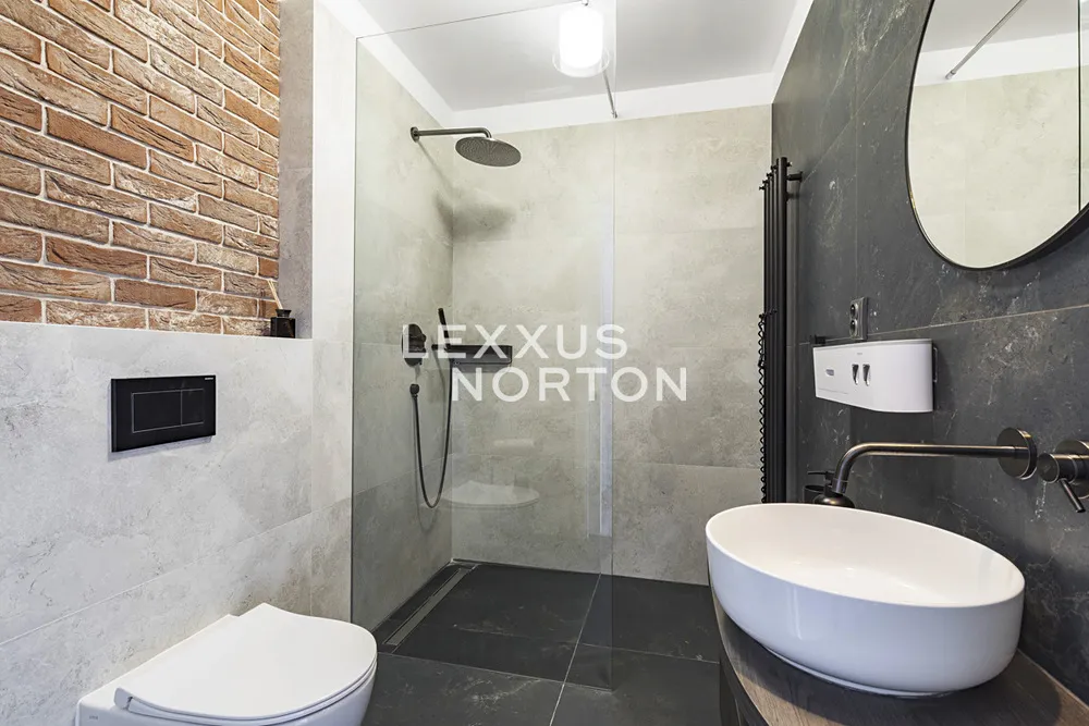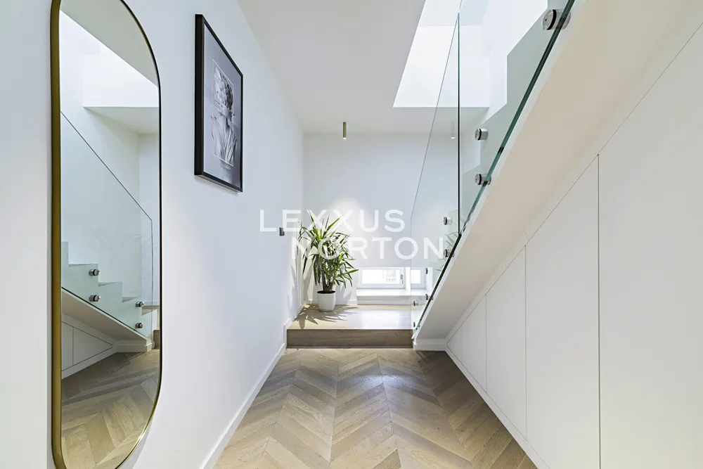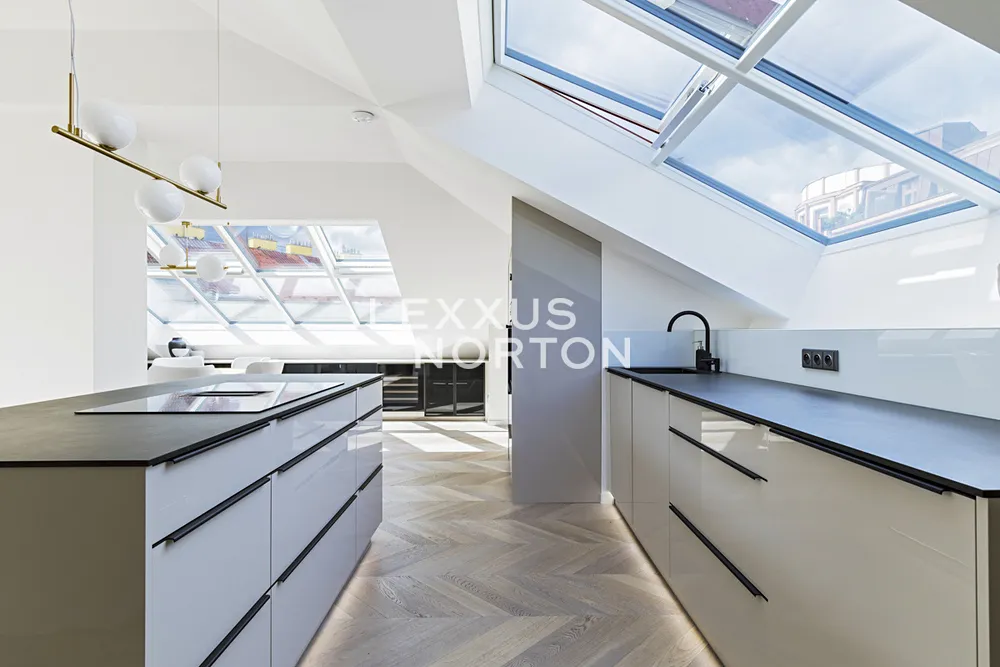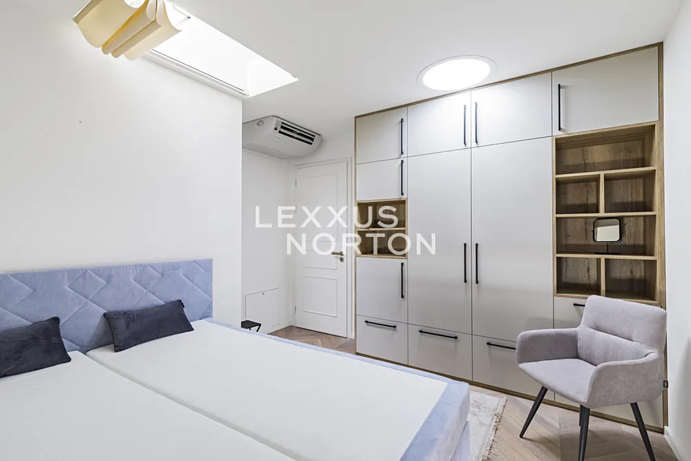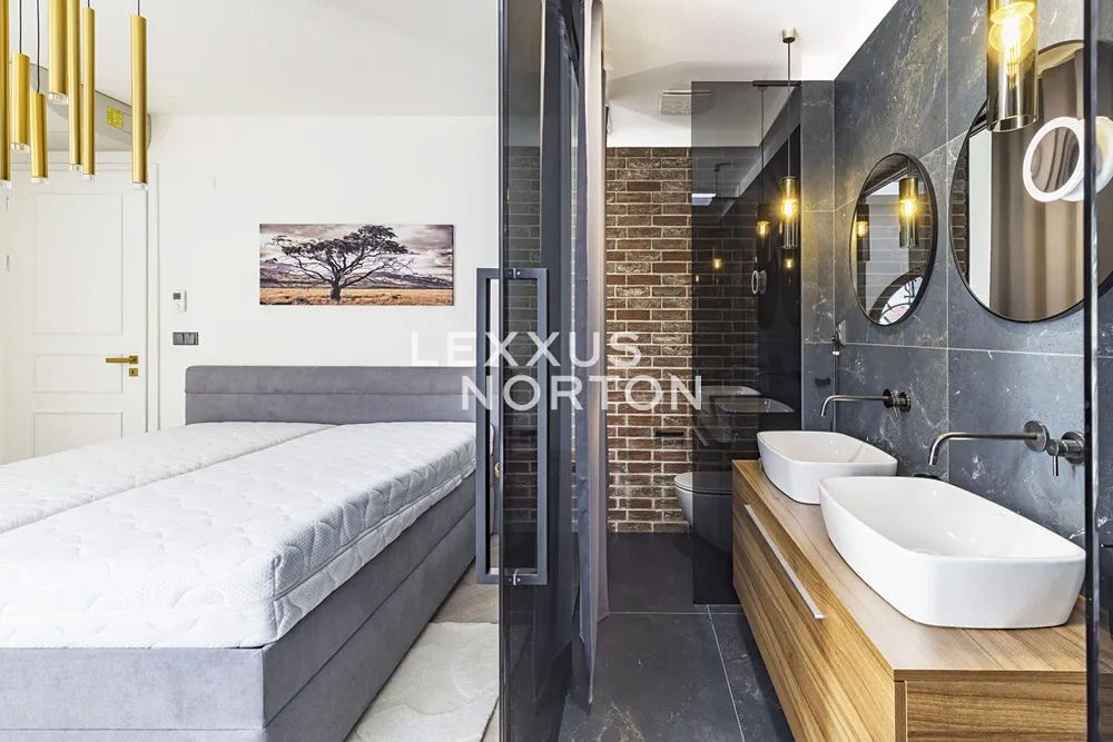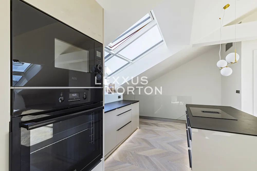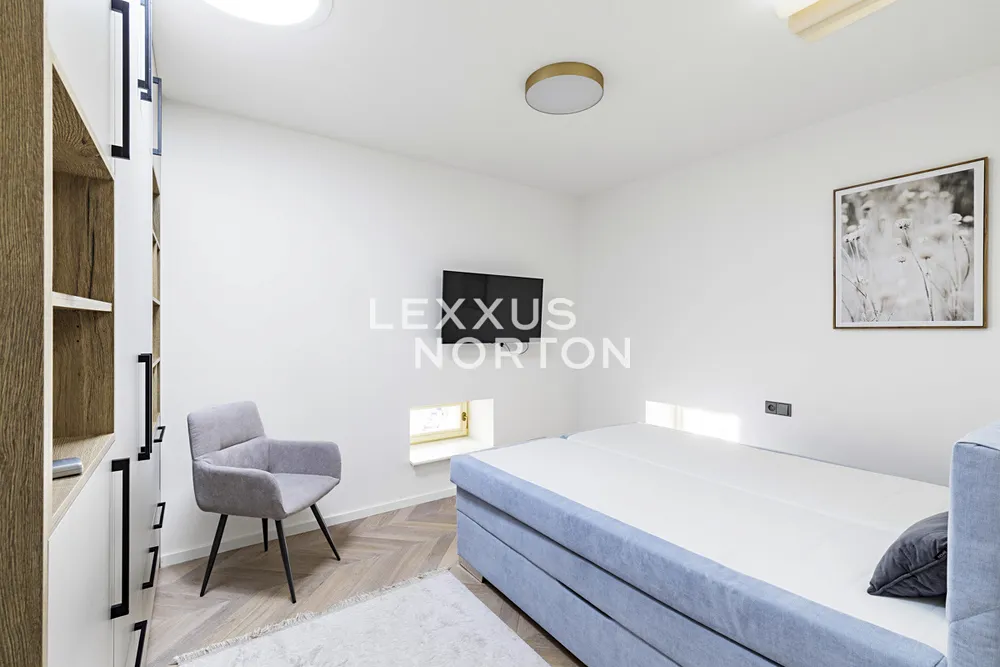 Tento klimatizovaný mezonet 4+kk k pronájmu se sestává ze dvou pater. Vstupní patro dispozičně nabízí chodbu s vestavěnými skříněmi, hlavní ložnici s vlastní koupelnou (sprchový kout, toaleta), další dvě ložnice, koupelnu (sprchový kout, toaleta) a komoru s pračkou a sušičkou. V horním patře se nachází prostorný obývací pokoj s krbem, plně vybaveným kuchyňským koutem (indukční varná deska, lednice, mrazák, mikrovlnná trouba, vinotéka,) včetně jídelního prostoru a samostatná toaleta. Součástí vybavení je klimatizace, bezpečnostní vstupní dveře a videotelefon. V ceně nájemného je zahrnuto užívání sklepu a parkovací stání ve dvoře včetně nabíjecí stanice pro elektromobily. Možnost pronájmu dalšího parkovacího stání za extra poplatek.