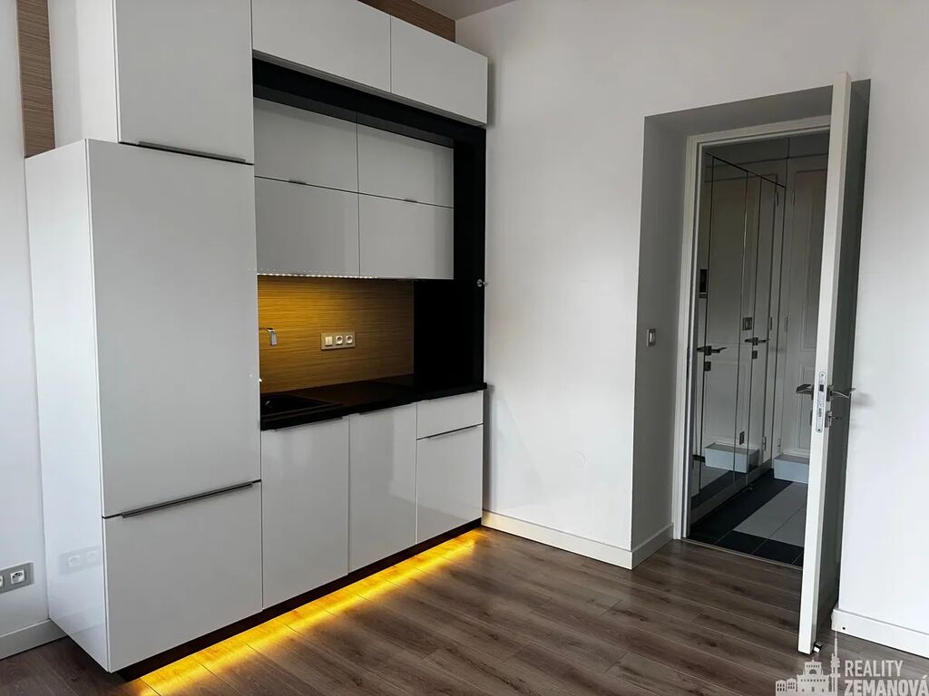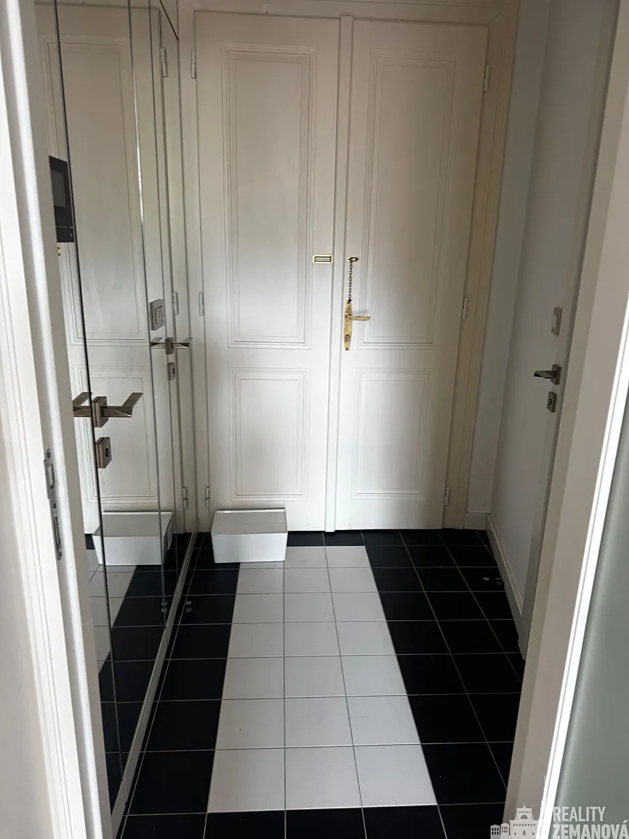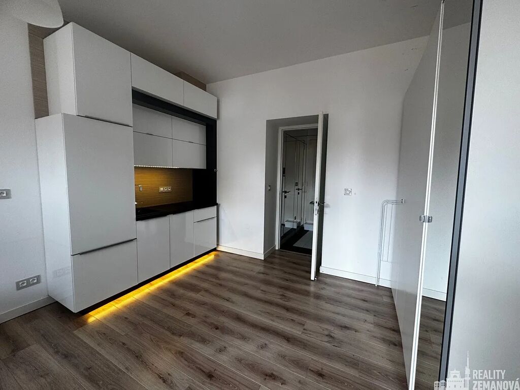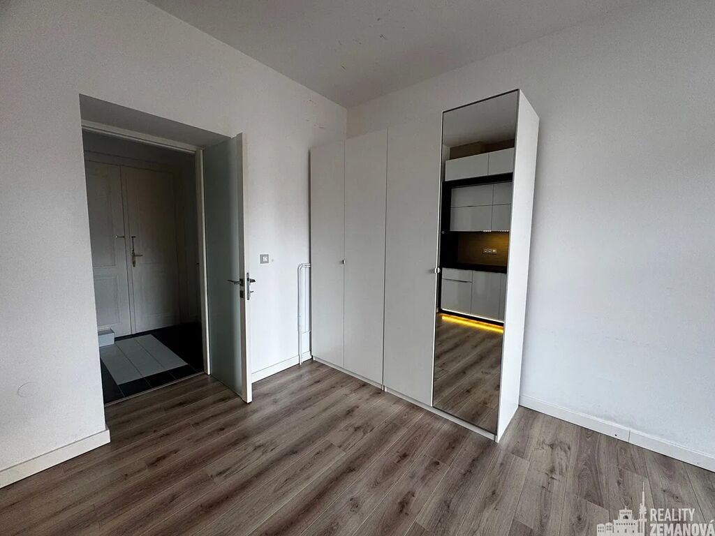Byt je nově vymalovaný a pronajímá se bez nábytku, vybavený je pouze kuchyňskou linkou se spotřebiči: elektrická varná deska (dvouplotýnka), digestoř, myčka, lednice s mrazákem a s bílou šatní skříní. Na oknech závěsy.
