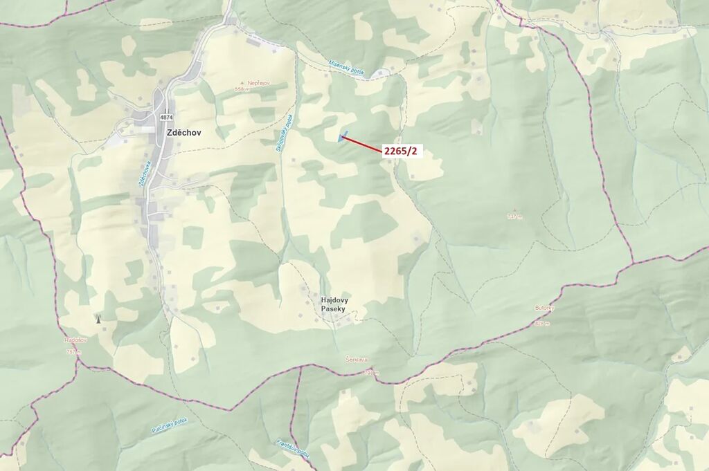 Lesní pozemek o výměře 2225 m2, parcelní číslo 2265/2, podíl 1/1, katastrální území Zděchov, obec Zděchov, obec s rozšířenou působností Vsetín, okres Vsetín, Zlínský kraj.