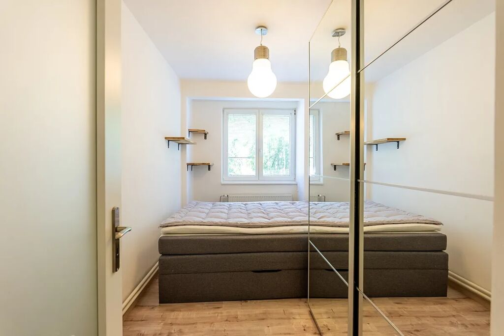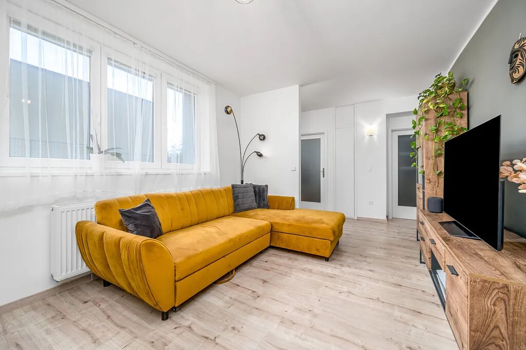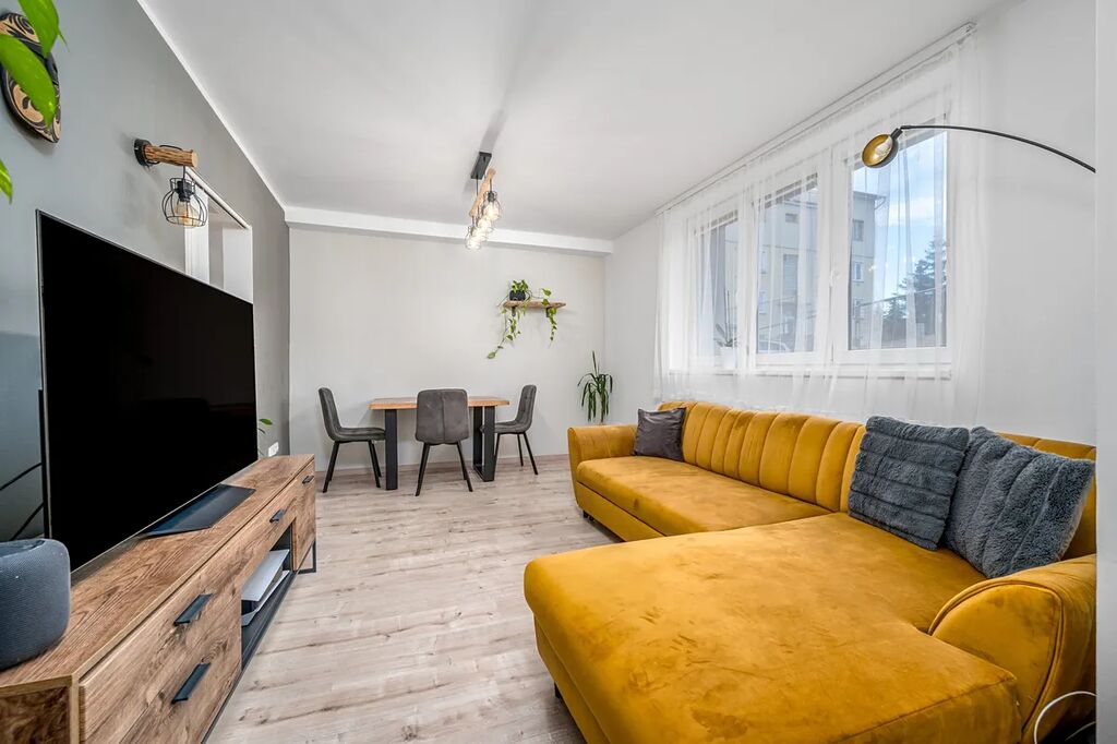 Byt se nachází v přízemí udržovaného cihlového domu z 60. let. Dispozice byla navržena s důrazem na maximální využití prostoru – k dispozici je světlý obývací pokoj s plně vybavenou kuchyňskou linkou, dvě neprůchozí ložnice a koupelna s vanou, umyvadlem a toaletou. Dostatek úložných prostor je samozřejmostí, nechybí sklepní kóje o velikosti 2 m² vhodná například pro sezónní věci.