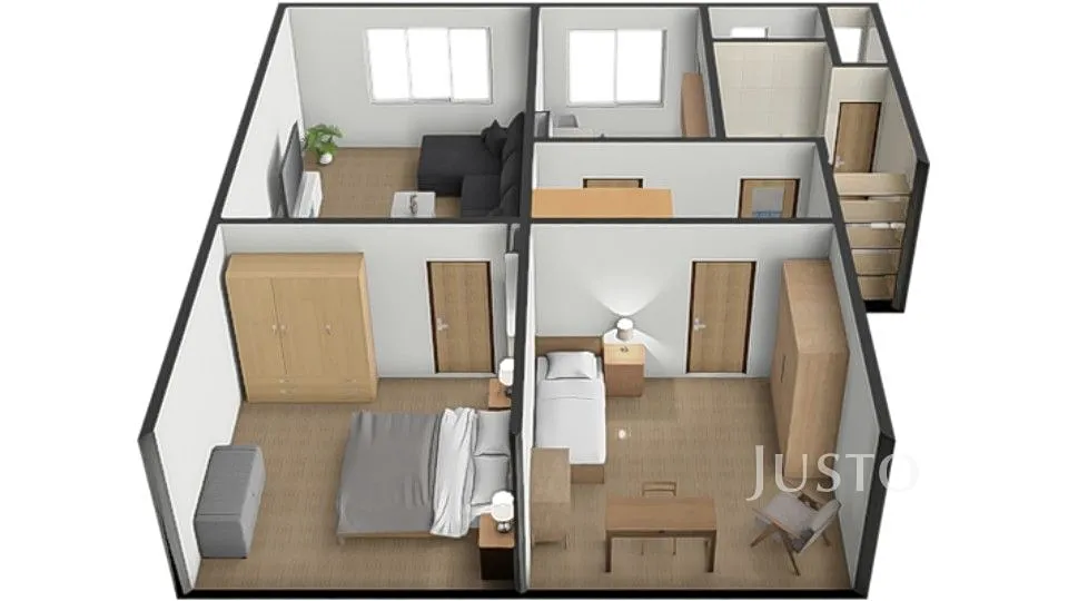 Dispoziční řešení bytu je 3+1 s užitnou plochou 72,5 m², v menším zděném domě bez výtahu.