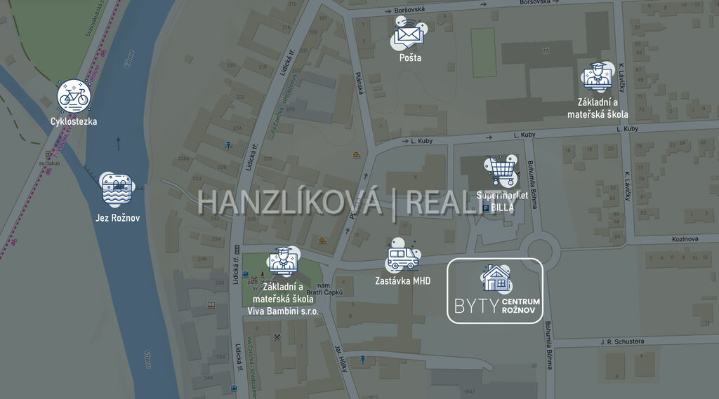 Bytový dům „BYTY CENTRUM ROŽNOV“ se nachází v jedné z nejžádanějších lokalit Českých Budějovic, v městské části Rožnov. Projekt je strategicky umístěn v klidné části města, vzdálené jen pár minut jízdy autem do centra a několik kroků od zastávky MHD. Bohatá občanská vybavenost ( mateřská a základní škola, dětský lékař, praktický lékař, veterinární klinika, obchod BILLA, několik restaurací, pošta) se rovněž nacházejí v těsné blízkosti. V Rožnově najdete několik dětských hřišť a cyklostezku, která vede až do centra města.