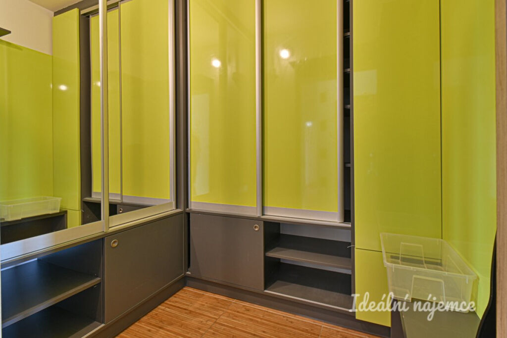 V předsíni se nachází vestavná skříň. V koupelně je k dispozici vana, umyvadlo skříňka a pračka, toaleta je samostatně, oddělená od koupelny. V kuchyni najdeme jídelní stůl a veškeré potřebné spotřebiče - lednice, mikrovlnka, myčka, trouba, indukční deska s digestoří. Obývací pokoj je přístupný z kuchyně a je zařízen sedací soupravou, se stolečkem, televizním stolkem a komodou. Jen z pokojů je vybaven 2 šatními skříněmi, druhý pokoj je nezařízený. K bytu navíc náleží balkón, šatna s sklep.