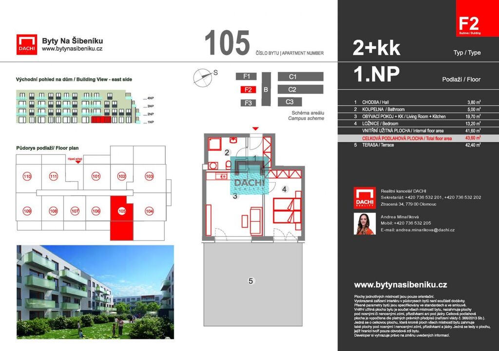 Navazujeme na úspěch první etapy a přinášíme vám jedinečnou příležitost pořídit si nový domov v atraktivním projektu Byty Na Šibeníku. DACHI, prodejce a partner developera, vám v rámci druhé etapy nabízí ke koupi byt 2+kk (č. 105) o ploše 43,6 m s terasou o velikosti 42,4 m. Byt se nachází v 1. nadzemním podlaží bytového domu F2, který je součástí šestipodlažního objektu se čtyřmi nadzemními a dvěma podzemními podlažími.