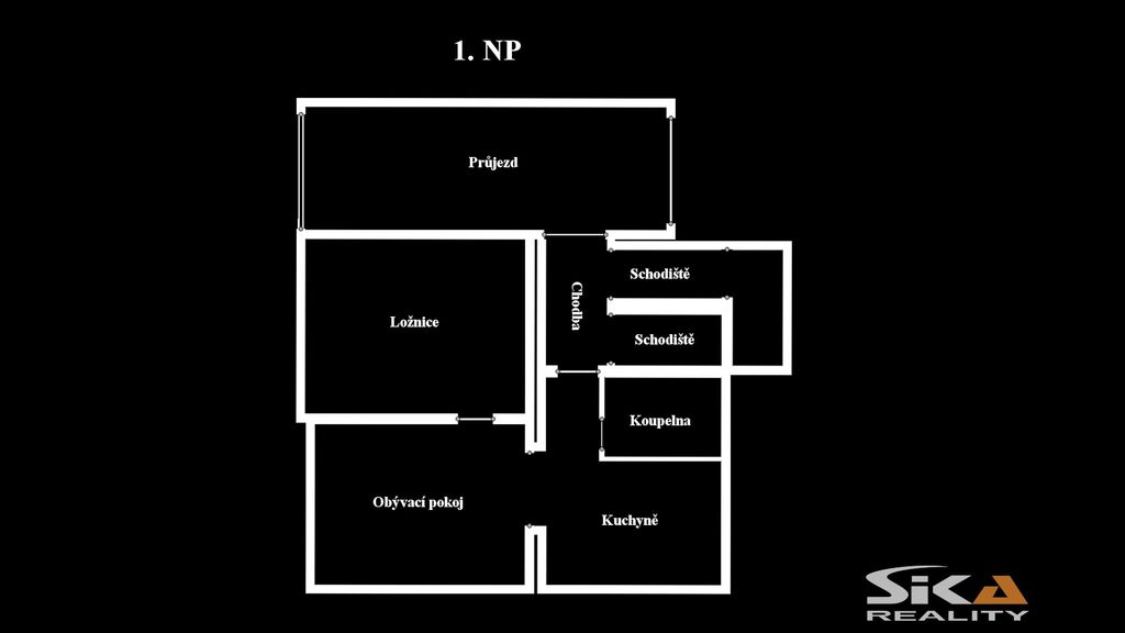 Do domu se vstupuje průjezdem, který propojuje zahradu domu s ulicí Jeronýmova, z průjezdu se vstupuje do prostoru schodiště, kterým lze nastoupat do vyšších poschodí, nebo sejít do prostoru sklepa. Z hlavní podesty v 1.NP je přístupný nabízený byt, kdy vlevo od vstupní chodby je umístěna koupelna se sprchový koutem, společná s toaletou, rovně z chodby vstoupíme do kuchyně (s okny do dvora), napravo od kuchyně jsou umístěny obývací pokoj a ložnice (s okny do uliční části).