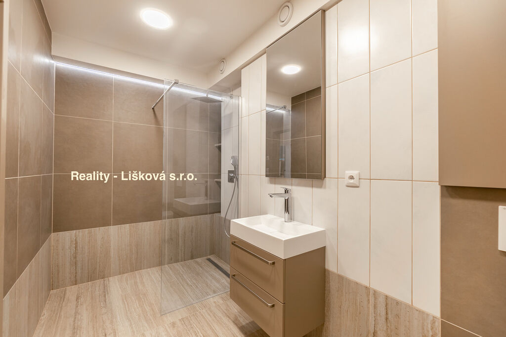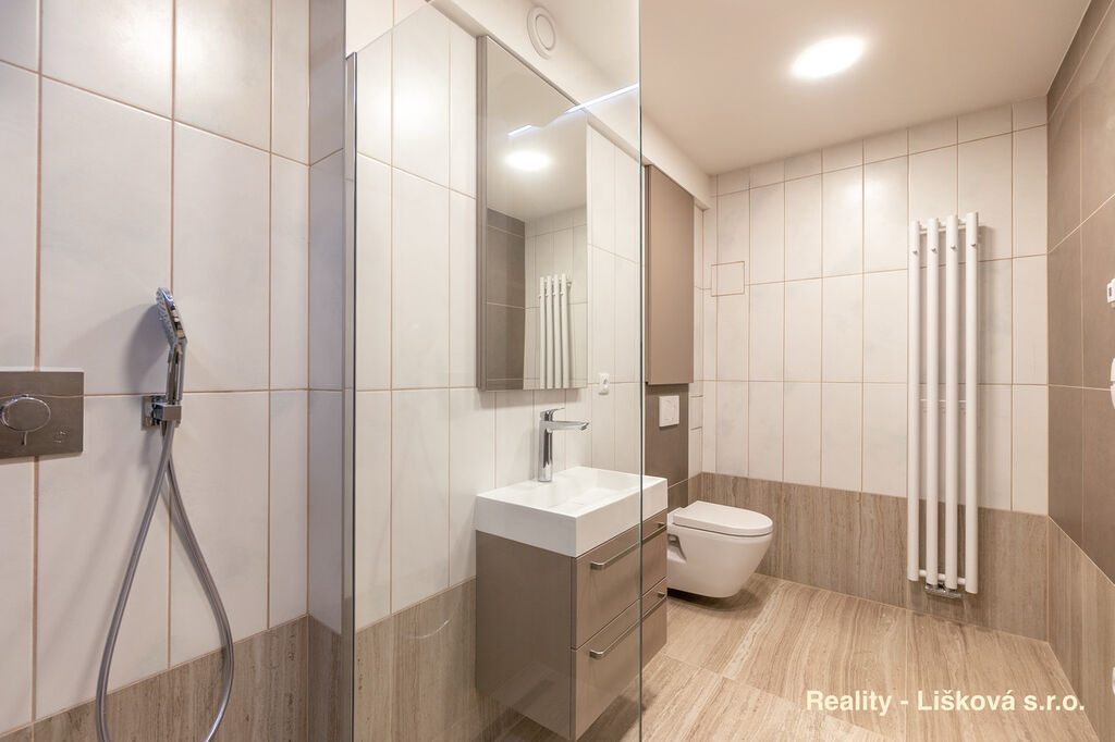Ateliér je vybaven kuchyňskou linkou, koupelnou se sprchovým koutem a závěsnou WC toaletou a dispozičně je řešen jako velké 1kk s odděleným prostorem k případnému přespání.