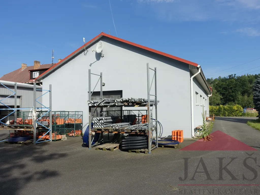Popis: skladovací hala (dvoje vrata o šířce 2,4 a 2,7 m) o velikosti 182,46 m2 s rozměry 10,2 m x 16,7 m + 2,5 m x 4,2 m a výškou 3,7 m, prodejna či kancelář 35,9 m2, chodba 7,4 m2, sociální zařízení 2,94 m2 (WC, umyvadlo) a denní místnost 6,88 m2 (kuchyňka, sprcha, šatna).