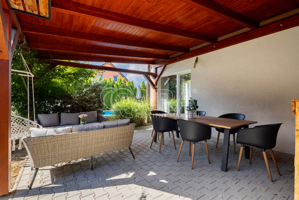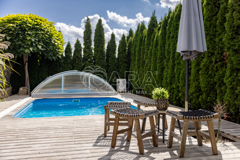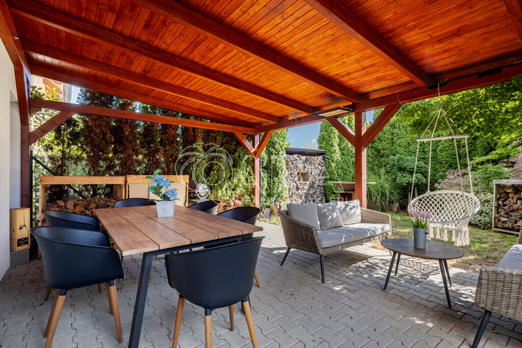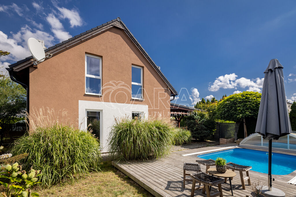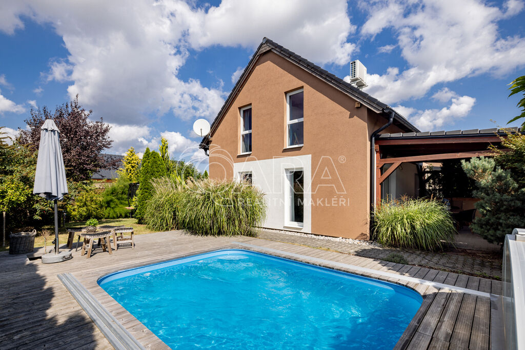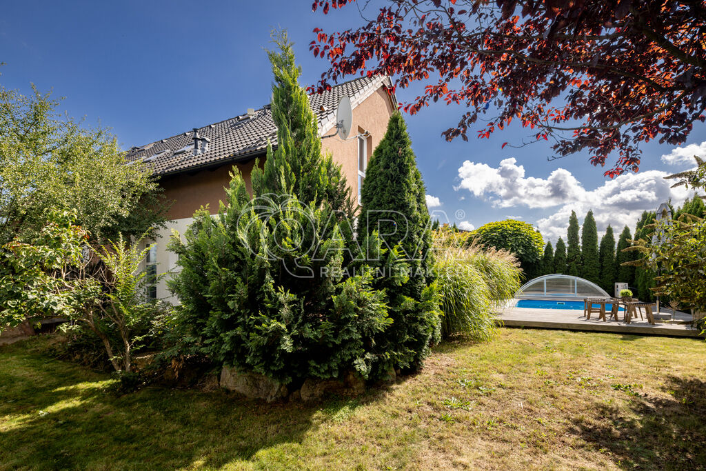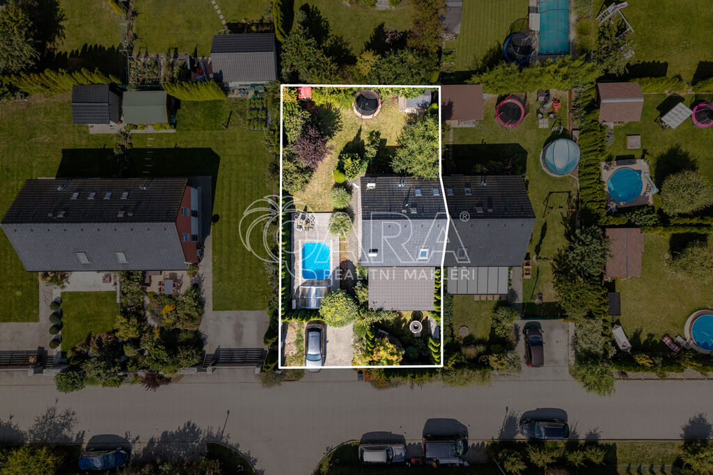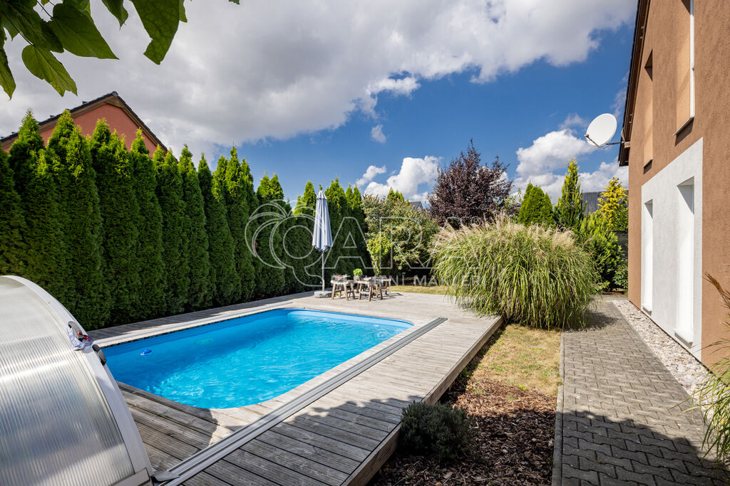 K tomu ideální velikost pozemku 479 m2 s krásnou a udržovanou zahradou, zastřešeným venkovním bazénem, terasou, velkou dřevěnou pergolou ( 30m2), zahradním domkem a litinovým grilem.