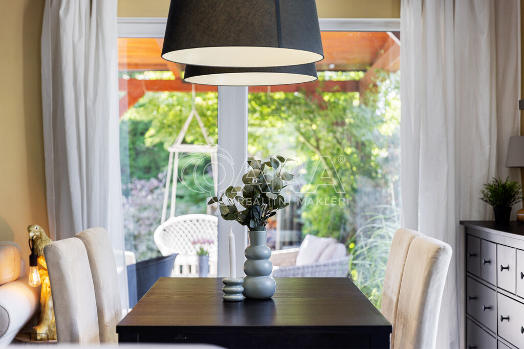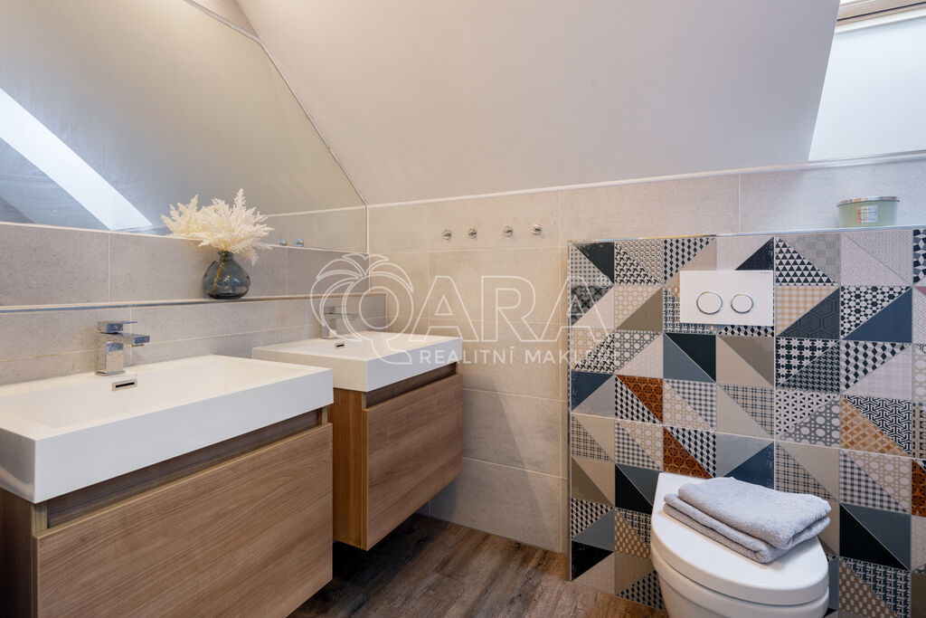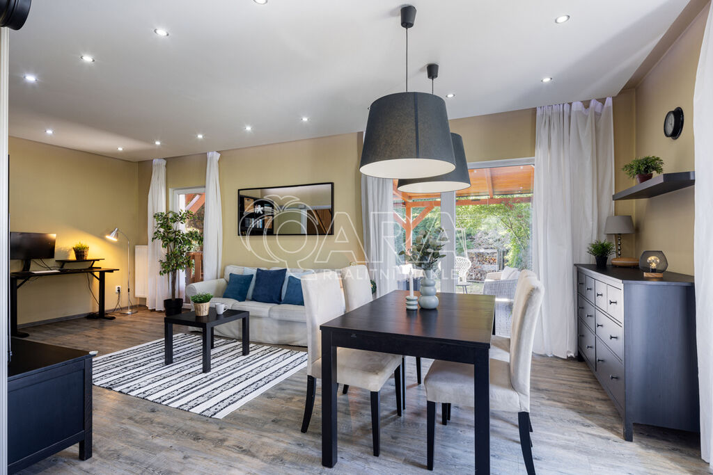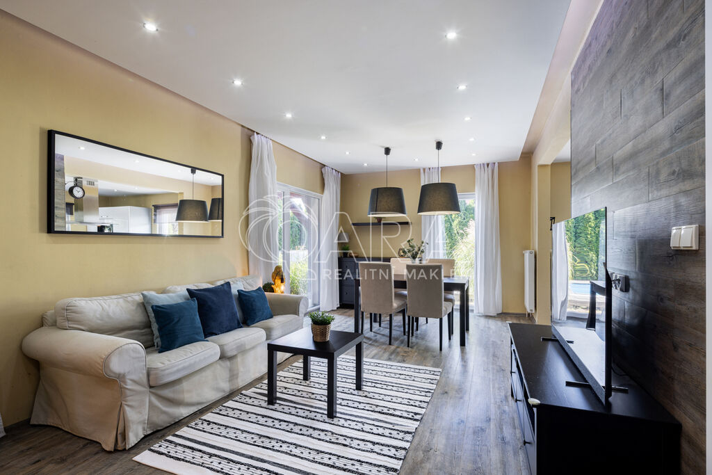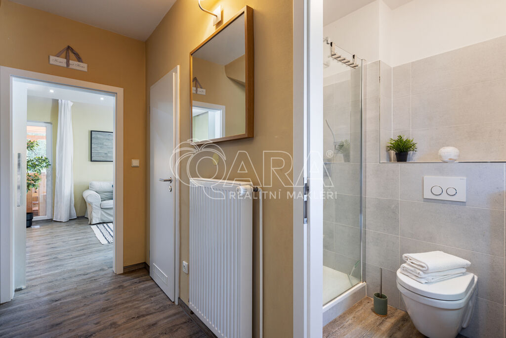 Uvnitř na vás čeká plně vybavená kuchyň s jídelním koutem, 2 koupelny, vinotéka, vinylové podlahy, 2 ložnice, potěší klimatizace, šatna, samostatná technická místnost s pračkou i sušičkou nebo prostorná obývací část.