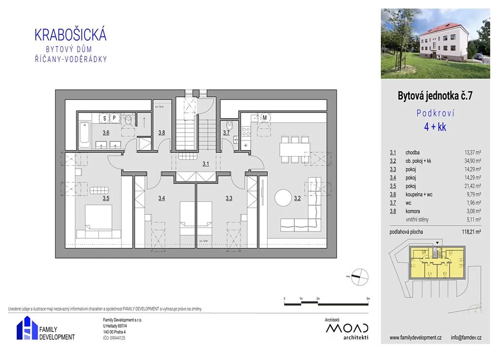 Nabízíme k prodeji novostavbu bytu o velikosti 118 m2 s dispozicí 4+kk umístěnou ve 3. podlaží zrekonstruovaného cihlového domu v ulici Krabošická, Říčany - Voděrádky.