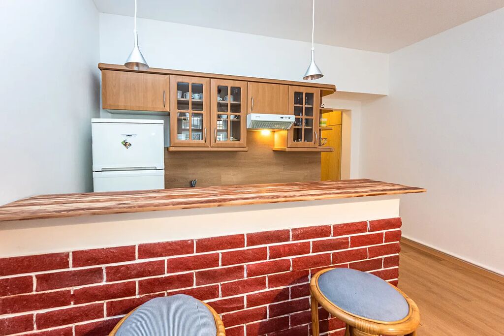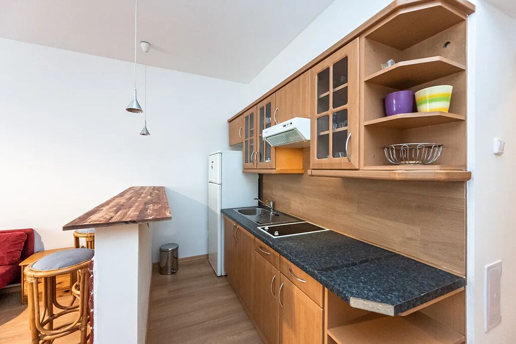 V kuchyňské lince je elektrická trouba s varnou deskou, lednice a digestoř. Obytná část je rozdělena praktickým barovým pultem. V obývací části je sedačka a skříň.