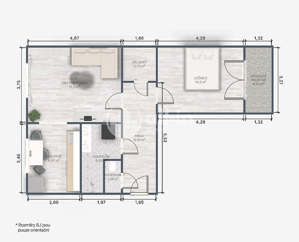 Nemovitost se skládá z předsíně, obývacího pokoje s kuchyňským koutem, ložnice, koupelny, samostatné toalety, komory a balkonu.