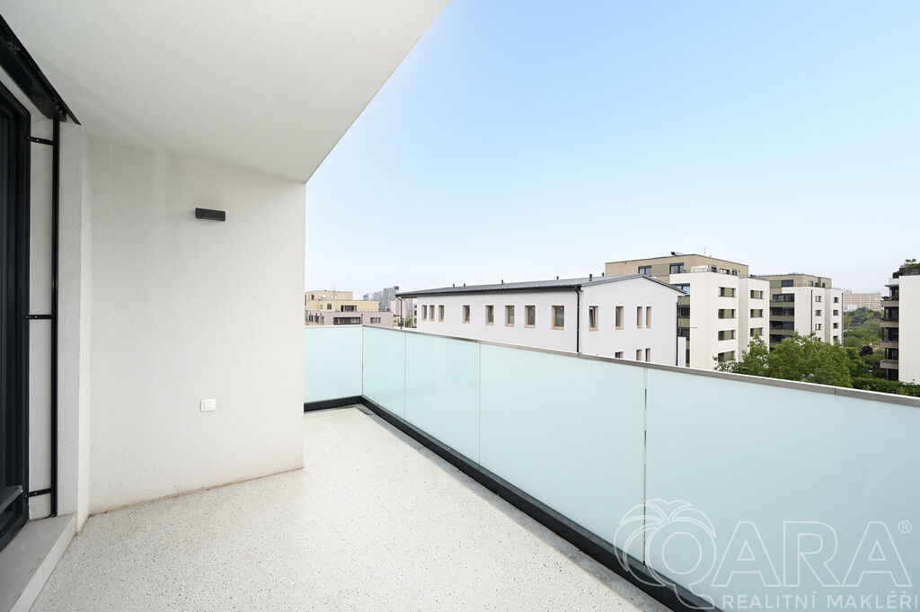 Byt dále disponuje dvěma pokoji o velikosti 14,2 m² a 13,2 m² a praktickou komorou připravenou pro umístění pračky a sušičky, které nejsou součástí pronájmu. Koupelna je vybavena vanou a samostatná toaleta s umyvadlem zajišťuje vyšší komfort. O pohodlí se starají kvalitní materiály a detaily, jako jsou hliníková okna s trojskly, dřevěné dýhované podlahy v pokojích i obývacím pokoji, sanita značky Villeroy & Boch a elektrické venkovní žaluzie na dálkové ovládání. Samotná budova je zařazena do energetické třídy B (velmi úsporná), díky čemuž se jedná o nízkoenergetickou rezidenci s nižšími provozními náklady. K bytu je navíc možné pronajmout i druhé parkovací stání za cenu 2 500 Kč měsíčně.
