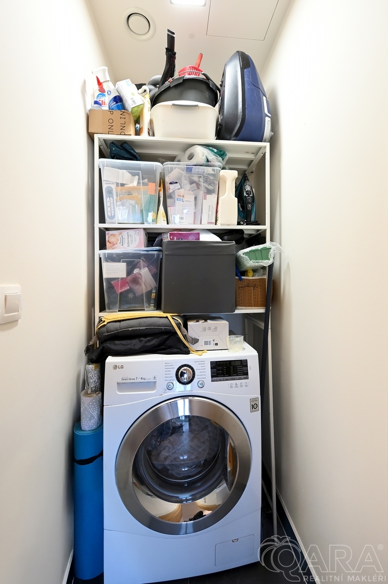 Po vstupu vás přivítá chodba, ze které se dostanete do prostorného obývacího pokoje s moderním kuchyňským koutem. Ten je plně vybaven vestavěnými spotřebiči, mezi které patří lednice s mrazákem, elektrická trouba, sklokeramická varná deska, digestoř a myčka. Součástí obývacího pokoje je i jídelní část s vnitřními žaluziemi. Na balkon o velikosti 11,6 m² je přímý vstup jak z obývacího pokoje, tak i z hlavní ložnice, což nabízí pohodlné propojení obou místností s venkovním prostorem.