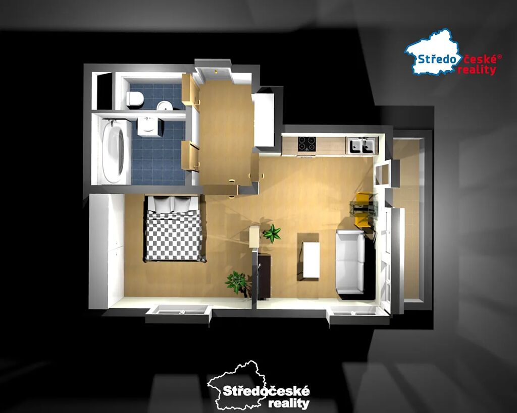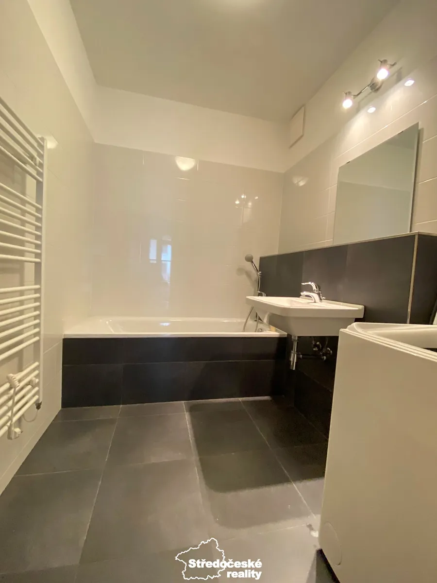 vstupní chodba (zde je vestavěná skříň), WC s umyvadlem (samostatné), koupelna s vanou (elektrický topný žebřík), obývací pokoj s kuchyní a jídelnou, ložnice (polootevřená s obývacím pokojem, zde je vestavěná skříň).